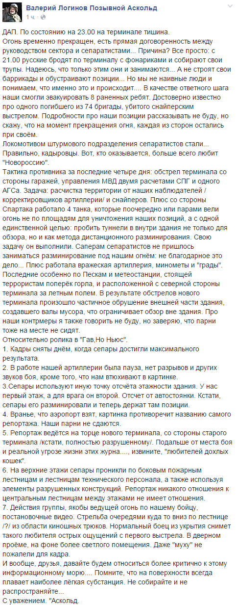 Як стало відомо з достовірних джерел, Захарченко поставив завдання своїм бандитам сьогодні взяти Донецький аеропорт. Йому про хід подій доповідають щогодини. До аеропорту підтягують підрозділи "Абхаза". Терористи планують влаштувати великий інформаційний вибух. Будуть іти з боку диспетчерської вежі. Для них не є новим прикриватися жінками та дітьми, але цього разу вони хочуть прикриватися місією ОБСЄ, знаючи, що наші, на відміну від бойовиків, вогонь по мирним мешканцям та міжнародним організаціям ніколи не ведуть.
