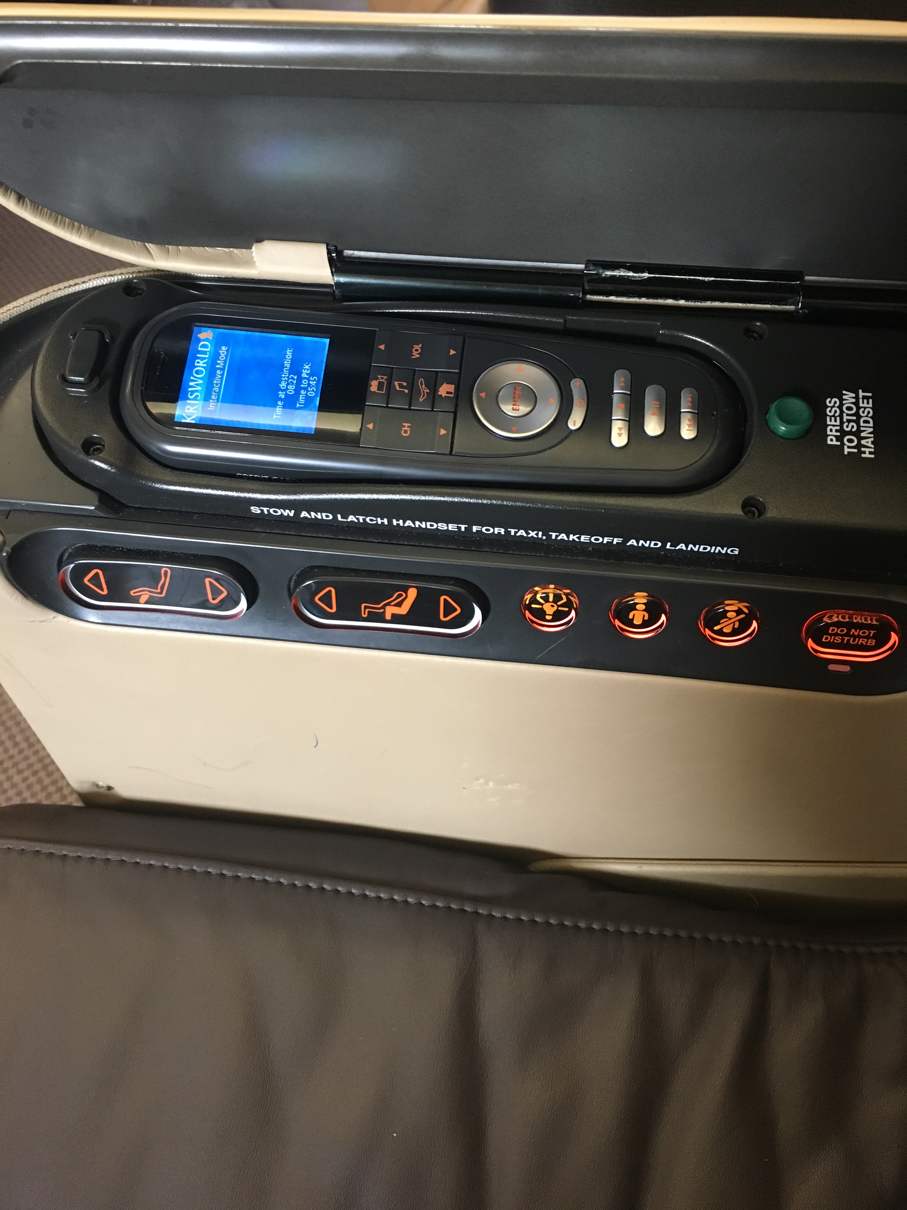 Посадка на рейс в Пекин началась вовремя, прошла быстро и я поднялся на верхнюю палубу крупнейшего в мире пассажирского самолета Airbus Industrie A380-800. Регистрационный номер 9V-SKN, 7 лет от роду. Почти вся верхняя палуба отдана под салон бизнес-класса в конфигурации 1-2-1, который был заполнен процентов на 30%. Кресла широченные, самые широкие в сегменте. Я бы даже сказал чересчур, из-за чего постоянно некуда деть одну руку – не хватает то одного, то другого подлокотника. Не очень удобный механизм трансформации в кровать и обратно. Зато классные подушки, простыни и одеяла. Хорошая система развлечений, замечательного вида стюардессы – знаменитые Singapore Girl.