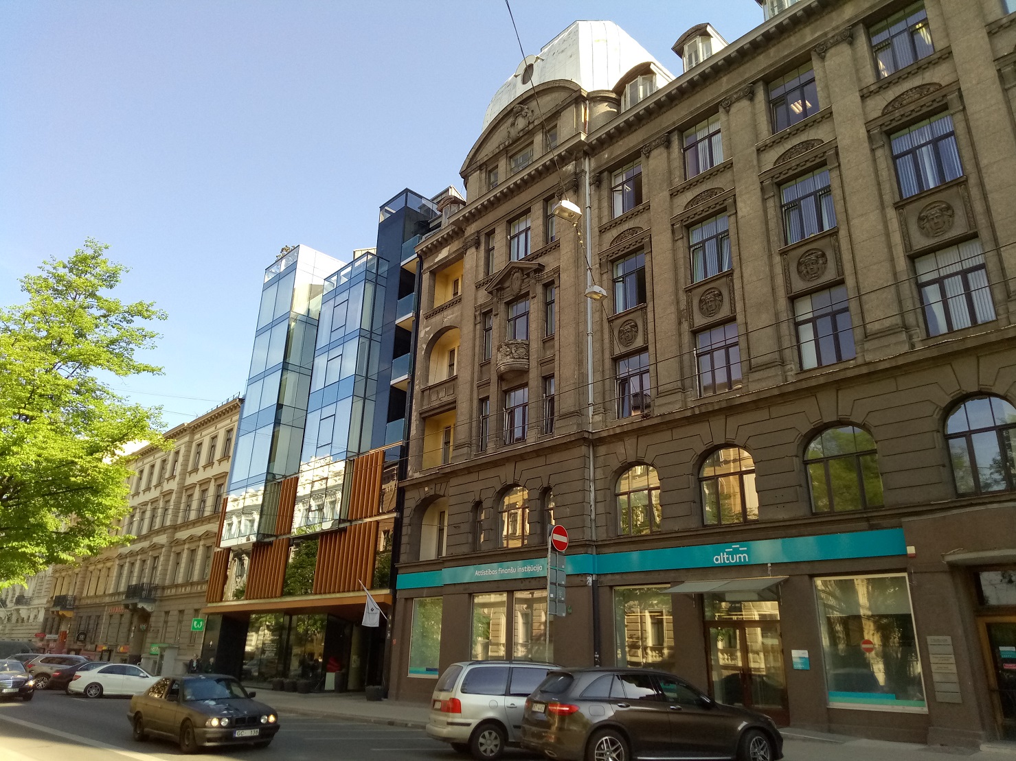 Сам номер. И, собственно, сам отель. Бывшее здание банка, построенное в стиле модерн, и удачно вписавшееся в средневековые кварталы. В Риге было 20 с небольшим градусов, и рижане говорили, что мне повезло с погодой, так как в это время, бывало, и снежок пролетал.