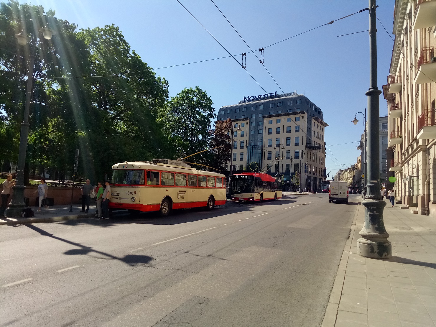 Проспект Гедеминаса - главная улица города. Здесь Вильнюс весьма напоминает то ли Черновцы, то ли еще какой-то наш город. Троллейбусы разных поколений на улочке, ведущей от Проспекта Гедеминаса к реке Нярис. Старые троллейбусы, если не ошибаюсь, сейчас используются для демонстрационных и экскурсионных рейсов.