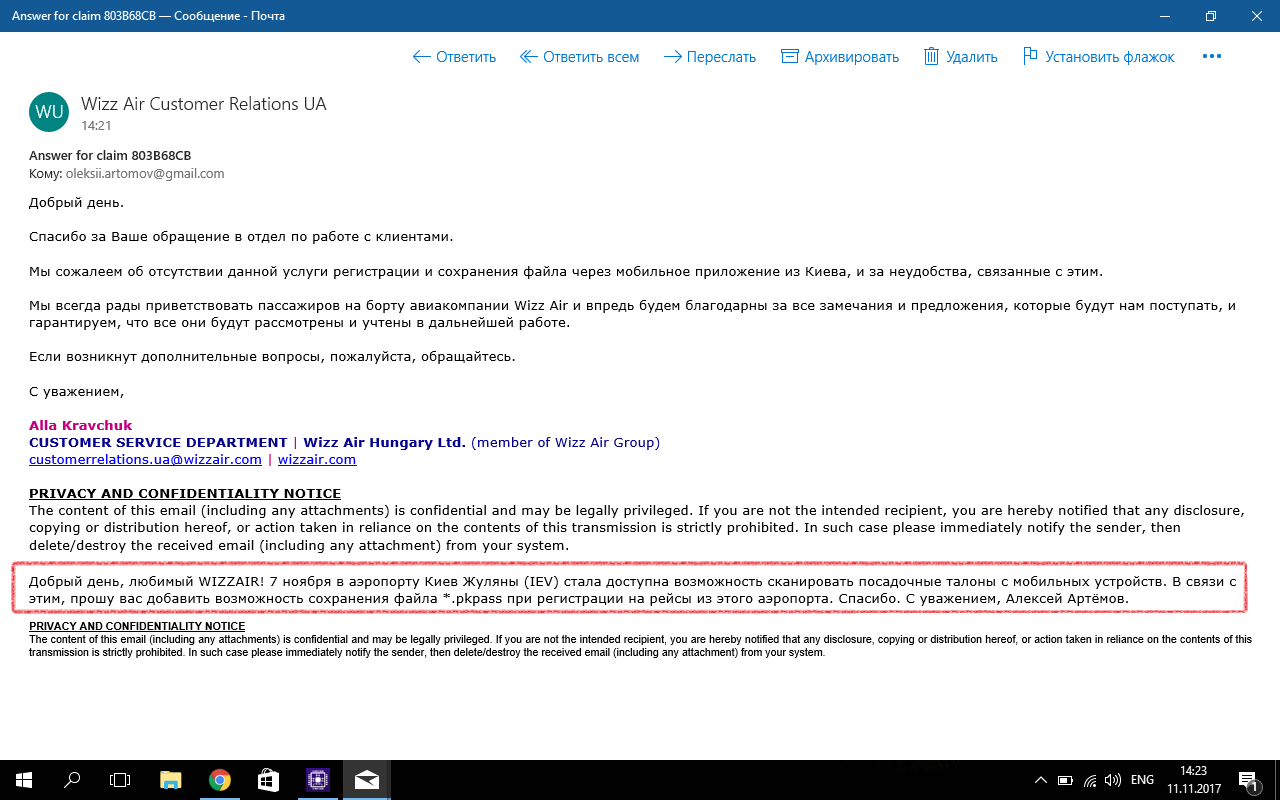 Вот такой ответ я получил на просьбу добавить возможность скачивать посадочный в формате pkpass на рейсы из киева