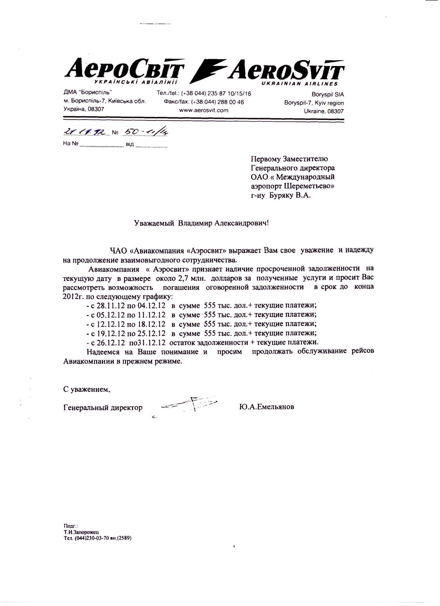 Авиакомпания «Аэросвит» обманывает своих пассажиров, партнеров и авиационные власти, заявляя в украинских СМИ о стабильности ситуации и погашении долгов перед аэропортом. В действительности авиакомпания «Аэросвит» продолжает практику неплатежей, нарушает график реструктуризации задолженности. Суммарный долг авиаперевозчика перед ОАО «Международный аэропорт Шереметьево», ЗАО «ТЗК Шереметьево» и ЗАО «АэроМАШ - АБ» превысил 165 500 000 рублей. В частности, задолженность авиакомпания «Аэросвит» перед ЗАО «ТЗК Шереметьево» составила более 60 000 000 рублей за авиационное топливо и услуги по заправке ВС.