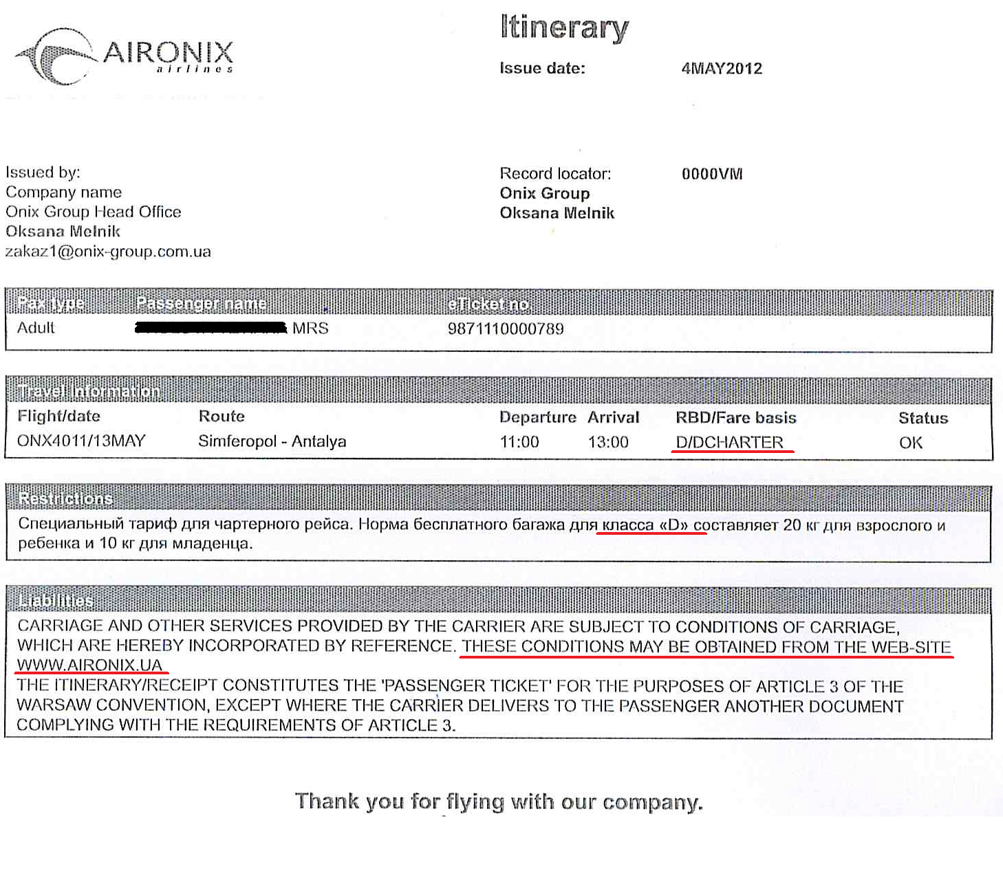 Получили билет AirOnix OW SIP (аннексирован Россией)-AYT 13MAY12, ни чем не отличается от билета выписанного на сайте, то же класс D, те же правила и условия, с которыми можно ознакомиться на сайте: Изменение бронирования до вылета со штрафом 20 USD за 1 участок. Возврат до вылета со штрафом 30 USD за 1 участок (отмечу, что это единственные правила для этого рейса). Никаких других условий или правил ни туроператор Оникс групп ни авиакомпания Эйр Оникс к билету не предоставили.Air Onix писав:Уважаемый Tavrid,