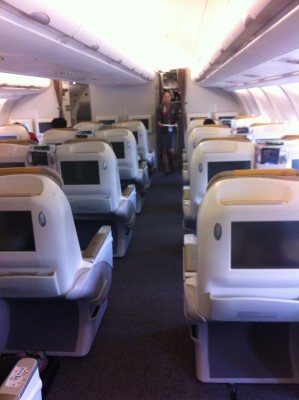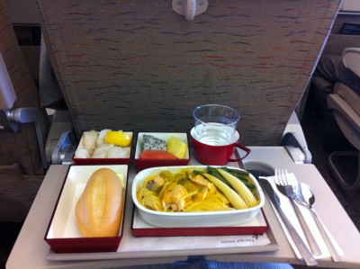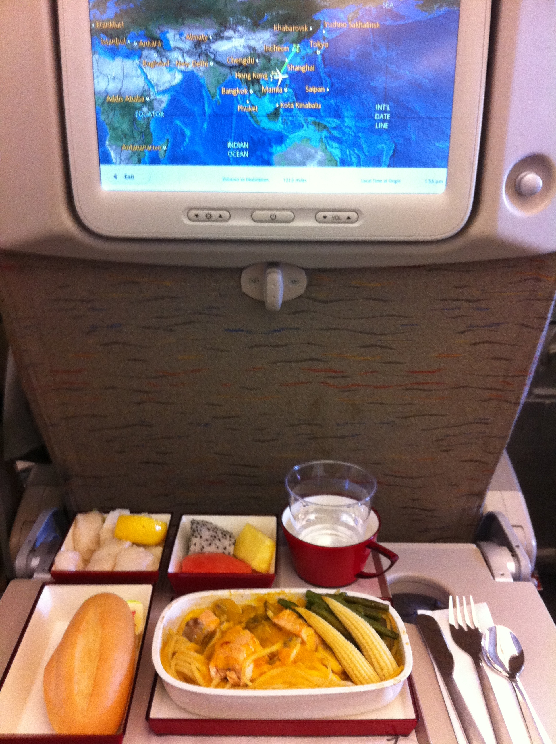 Я узнал у персонала на гейте, что загрузка рейса составляет в экономе 90%, а также то, что кресло рядом с моим 19К будет пустым, чему очень обрадовался. Самолет 772, похуже, чем А333. Экраны меньше, места для ног тоже. Но сервис, питание и чистота на таком же высоком уровне. Более того, впервые в экономе раздавали тапочки! 7 из 11 часов полета мне не спалось. Посмотрел 3 фильма, покушал и только когда пересекли линию смены дат и окончательно рассвелор я немножко поспал.