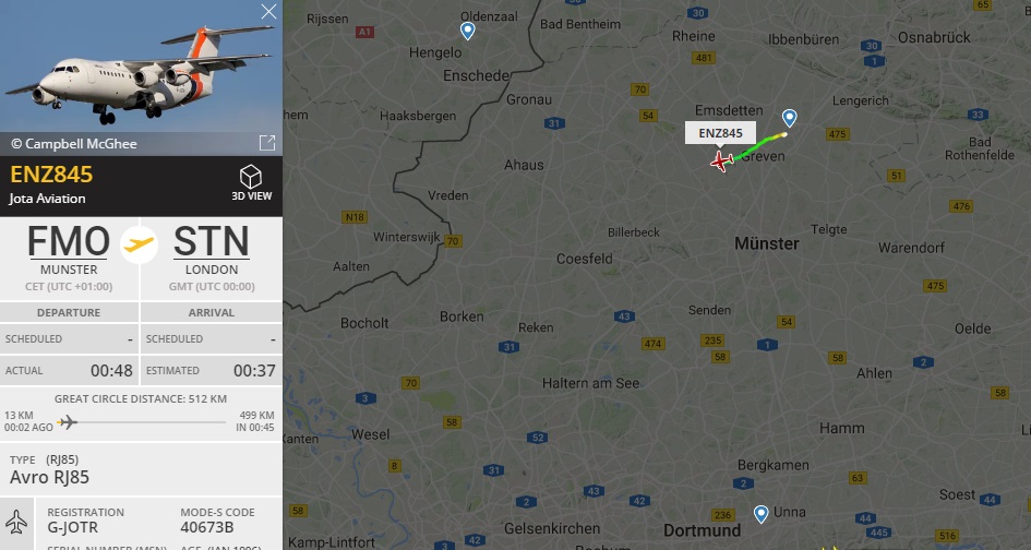 Тоттенхем в этот раз использовал Avro 85, Jota aviation, G-JOTR – полностью укомплектованным бизнес классом. Британские клубы любят самолеты в такой компоновке. Борт привез команду в Дортмунд, улетел на перевозку молодежки Манчестер Юнайтед в Базель, а уже с Базеля вернулся в Мюнстер за Тоттенхемом, так как аэропорт Дортмунда ночью не работает.