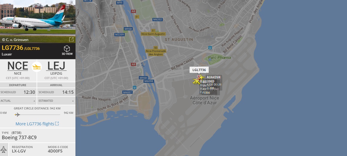 RB Лейпциг улетает около 15.00 из Ниццы на 737 LX-LGV Luxair. Все 3 выездные матча Лейпциг летел именно на этом борту. Самолет привез и ожидает.
