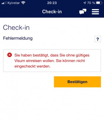 Що з check-in не так на Люфтгазі офіційному сайт та у додатку App ?! Неможливо зарієструватись на літак за 23 години , просить Візу підтвердити- я підкреслюю графу що немає візи, а він ігнорує й не веде мене далі до завершення процесу Check-in, це просто жахливо, сервіс немає жодного контакту по Е -Майл -не доступний та тел.не доступний, ніхто трубку не бере. Я думала що у МАУ сервіс най паскудніший ((( завжди було просто у Люфтганзи реєструватись - зараз показились..
