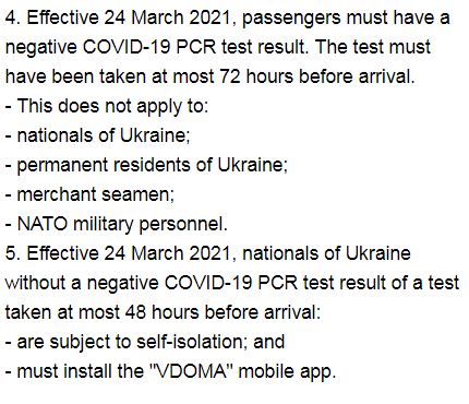 * всім іноземним туристам (держ.кордон) - тільки тест за 72 години (раніше для "червоних" країн було на вибір: або тест за 48 годин, або (само)ізоляція з “Вдома”; зараз такого вибору іноземні туристи не мають: ніякої ізоляції, тільки тест, і для всіх країн, без винятку);