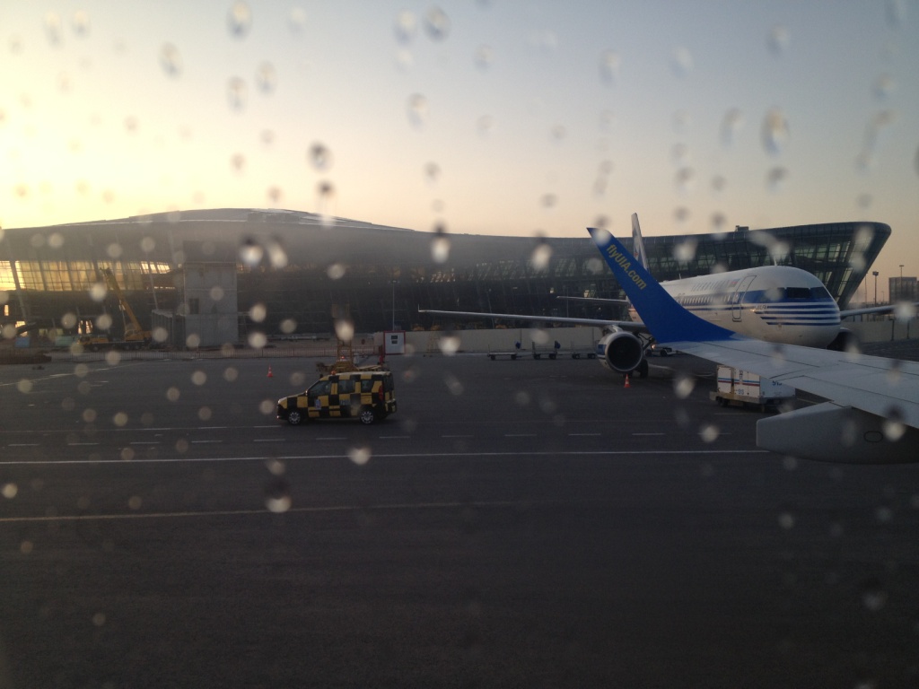 Ранний вылет предполагал выезд из отеля в 5:30 утра. Дорога в аэропорт по пустому ночному Баку - не менее красивому, чем днем - заняла минут 15-20. Аэропорт представляет из себя один терминал, как я понимаю, далеко не новый, однако довольно прилично выглядящий внутри. Он формально разделен на северную и южную части. Зарегистрировавшись предыдущим вечером онлайн и распечатав посадочный, я сразу направился к секьюрити-чеку. Работник аэропорта с недоверием посмотрел на распечатку посадочного, но после моего пояснения чем именно является этот лист бумаги пропустил меня дальше. После прохода через рамку металлоискателя я направился к стойкам паспортного контроля. Работало две из них: одна для граждан Азербайджана, вторая для для иностранцев. Очереди состояли буквально из 1-2 человек. Сонная пограничница отказалась пропускать меня дальше, сказав поменять посадочный "на нормальный". Пришлось возвращаться к стойкам регистрации (всего их было 4, на всех регистрировался эконом-класс), где уже рассосалась большая очередь, и получать стандартный посадочный. Работник аэропорта с улыбкой спросил, действительно ли я собирался лететь с распечаткой посадочного и снова ухмыльнулся, услышав мое "конечно".