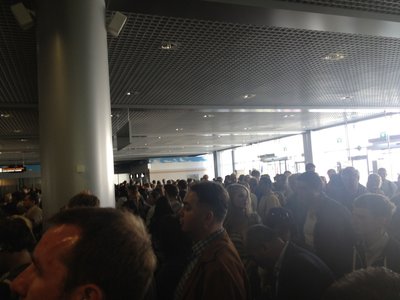 Посадка на дальнюю от терминала F полосу, очень долгое руление и открытие дверей точно по расписанию. Всех пассажиров, а загрузка была процентов за 80, как сельдей в бочку утрамбовали в один автобус. Нам повезло, что перед нами сел только один рейс, потому что уже за нами в зоне паспортного контроля собралась огромная толпа с позднее севших самолетов. При этом стойки, где контроль проходится с помощью белых карточек пустовали. В зоне таможенного контроля досмотр очень избирательный, далеко не всех просили поставить вещи на интроскоп.