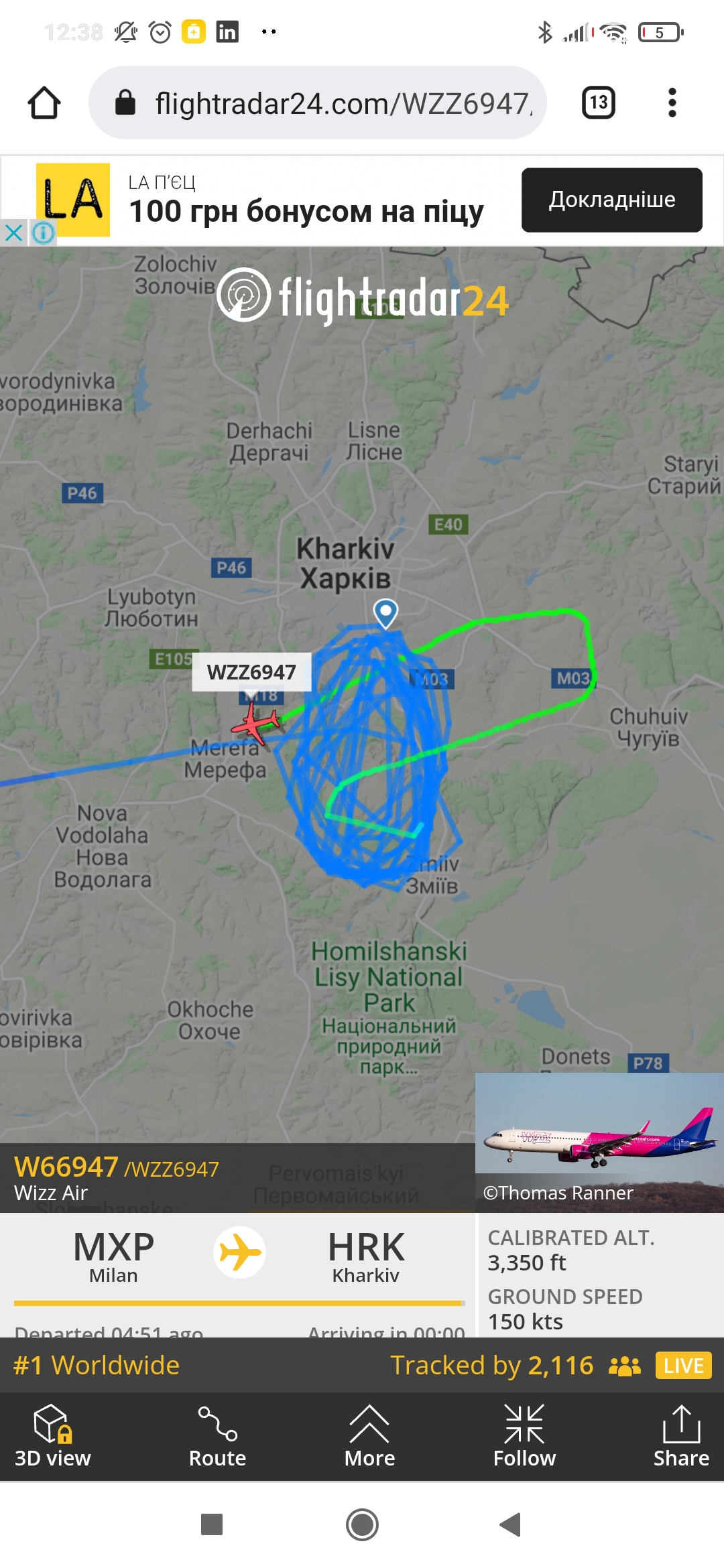 Лучше бы сразу на Жуляны ушел. 2,5 часа над Харьковом висел...