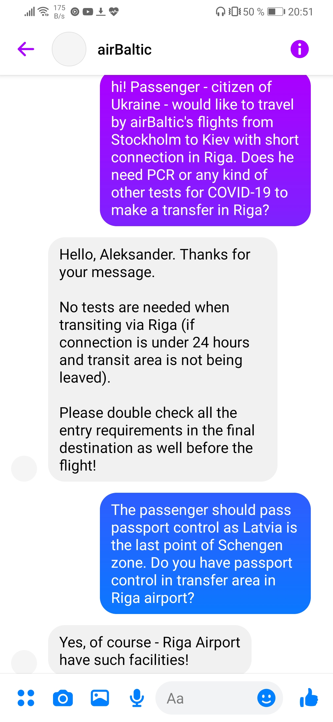 И перед тем, как без теста отправлять пассажира транзитом через Ригу, уточнил в авиакомпании все.