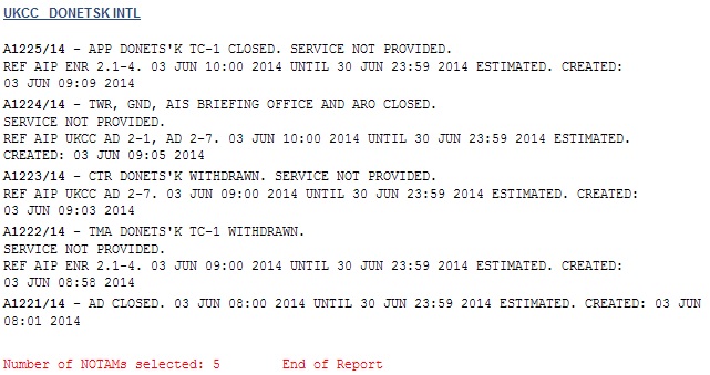 Ну или кто-нибудь когда-нибудь видел за последние дни NOTAMы cо сферой дейтвия "Е – маршрут" или "W – навигационное предупреждение"? (по аэродромам "A" как я понял уже поздно смотреть - закрыты надолго. Но Луганский закрыли как раз перед бомбёжкой "02 Jun 2014 1100 UTC", т.е. если не ошибаюсь в 13:00.