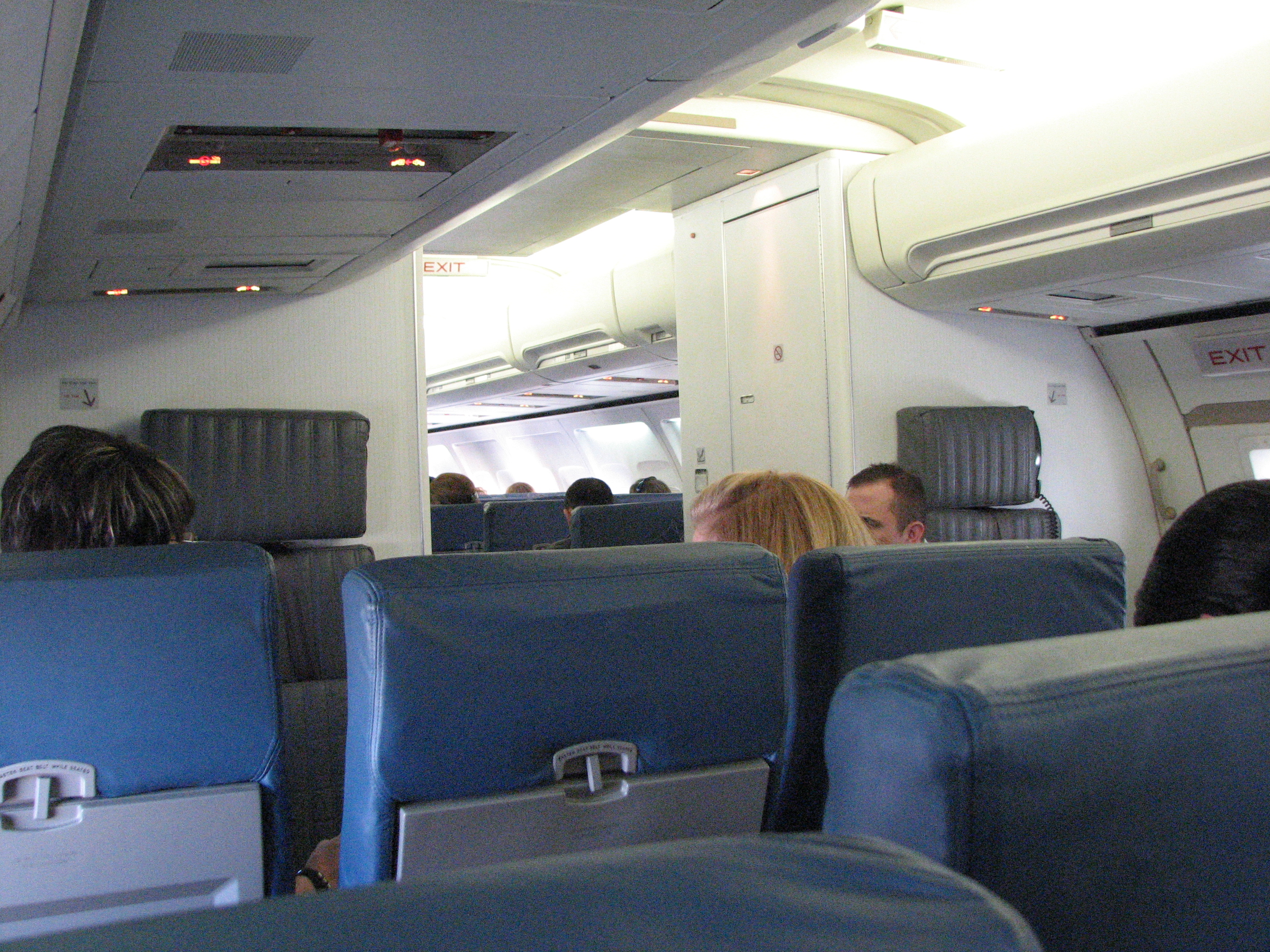 Я сидел в одном их последних рядов по правому борту. В последнем ряду сидели двое молодых ребят, с которыми во время посадки болтала какая-то взлохмоченная женщина лет 55-ти в красном свитере. Она спрашивала откуда они, куда летят (“and where are you, guys, heading to after Cinci?), что-то спрашивала про их подружек—складывалось впечатление, что она планировала заняться с ними сексом во время полёта. Когда начали демонстрацию оборудования, вдруг оказалось, что это была бортпроводница—она схватила ремень и побежала через пол салона демонстрировать его, не спуская взгляд с ребят.