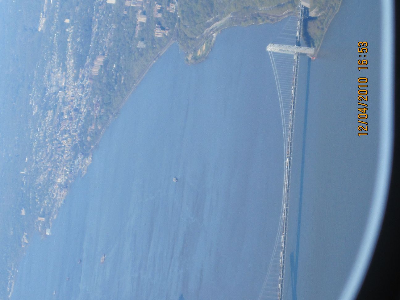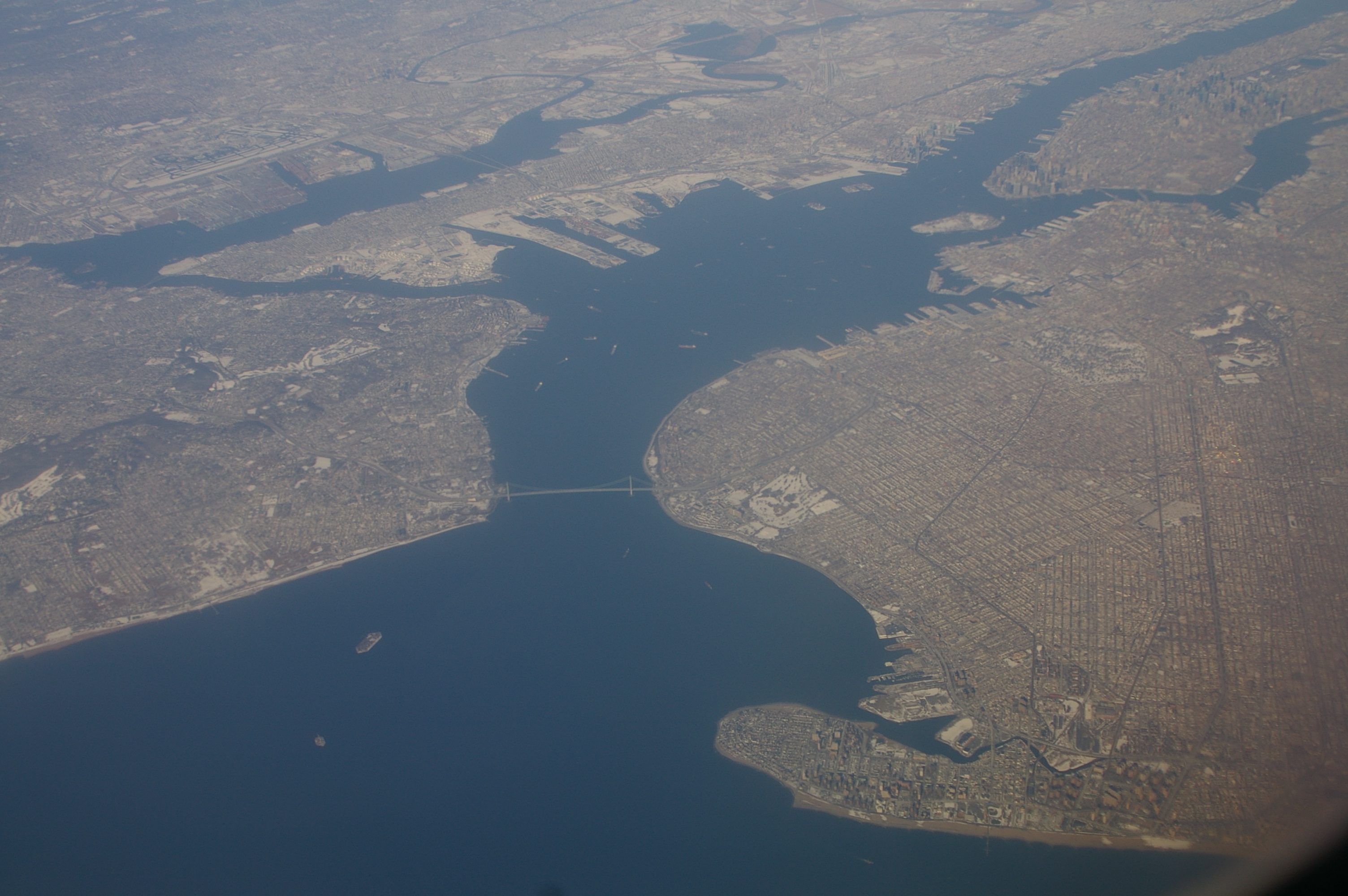 Справа--Бруклин, соединённый с районом Стейтен Айленд (слева) мостом Verrazano-Narrows Bridge--самым длинным в мире подвесным мостом (1298м) на момент его сооружения в 1964 г.) В правом верхнем углу--Манхеттен и над ним--река Гудзон. На самом верху--города в Нью-Джерси.