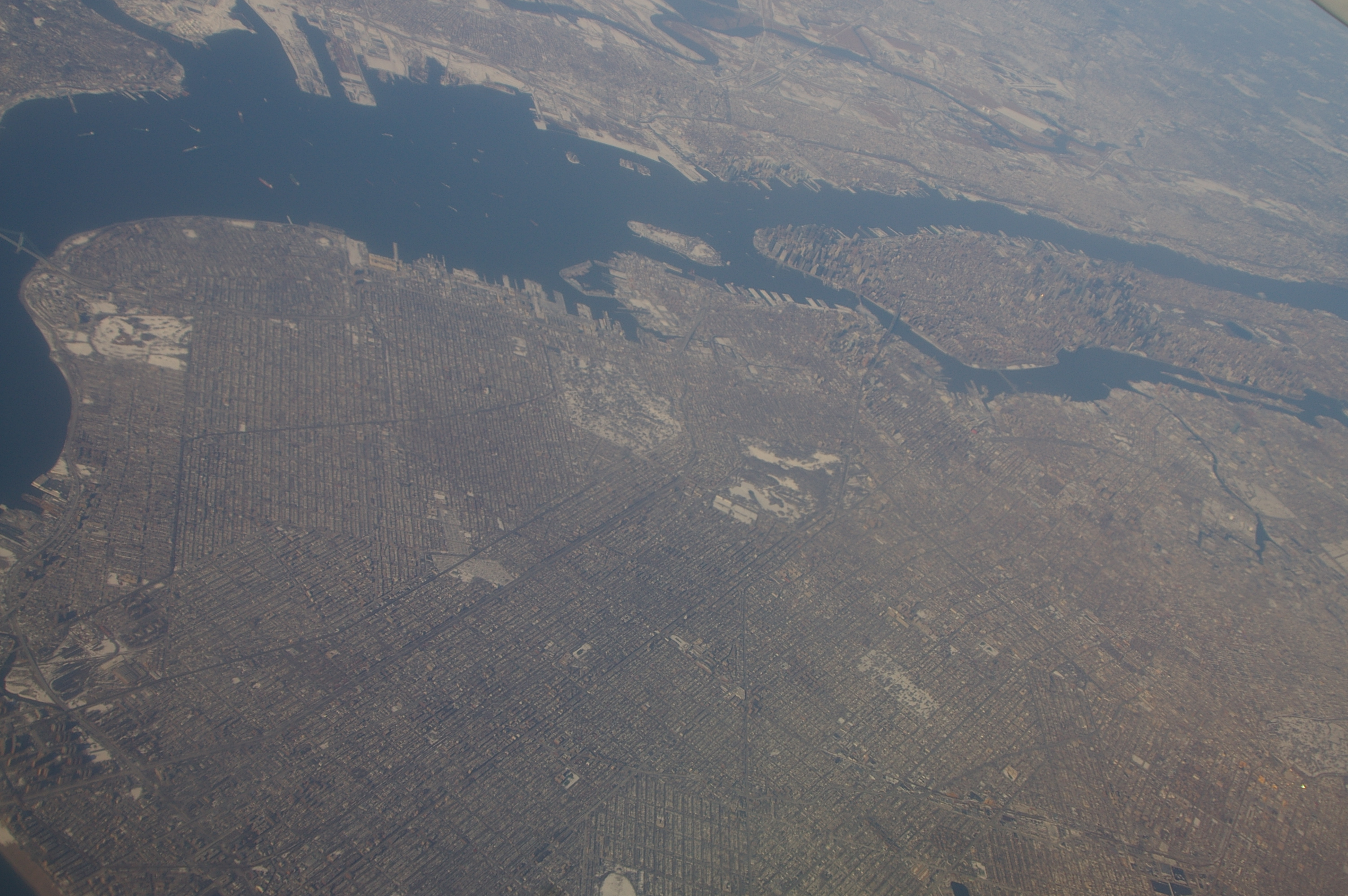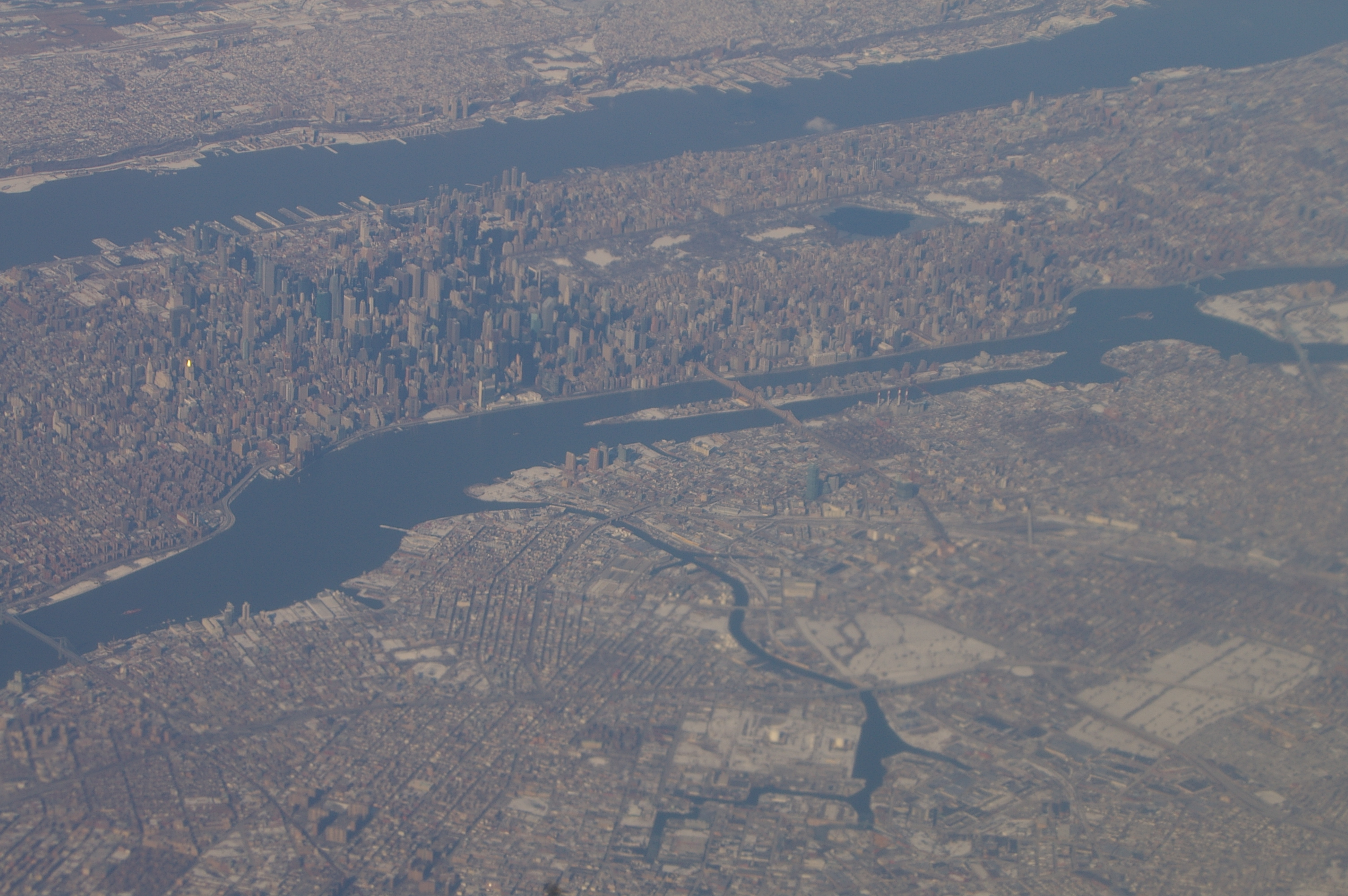 На переднем плане--часть Квинса, через Ист Ривер--Манхеттен: мидтаун и аптаун с серым прямоугольником зимнего Центрального Парка.