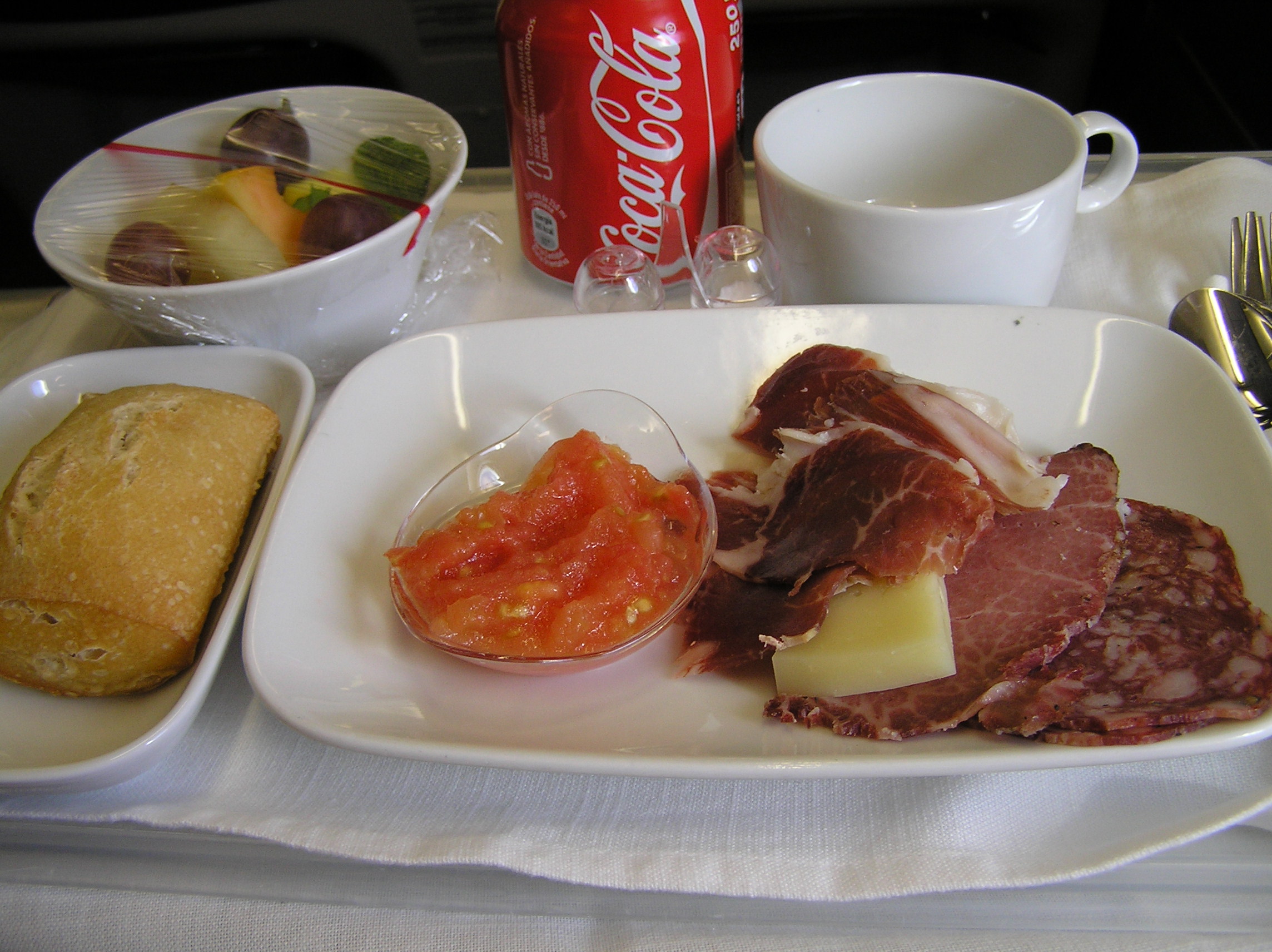 З Лісабона летів на А319, в Мадриді пересів на А340-300 (який до речі починає свій політ в Барселоні, потім підбирає паксів в Мадриді, а вже звідти вже летить до Сан-Пауло). На моє прохання навіть зробив деякі фотки їдла (на шляху туди). На шляху назад літак вилетів із запізненням, в результаті 1-годинна стиковка в Мадриді була пропущена, і в Лісабон він повернувся на 3 години пізніше запланованного. З Бразилії в якості подарунка віз 4 пляшки вина (захованих в багажі) - при перевірці витягли дві пляшки, дві - залишили.