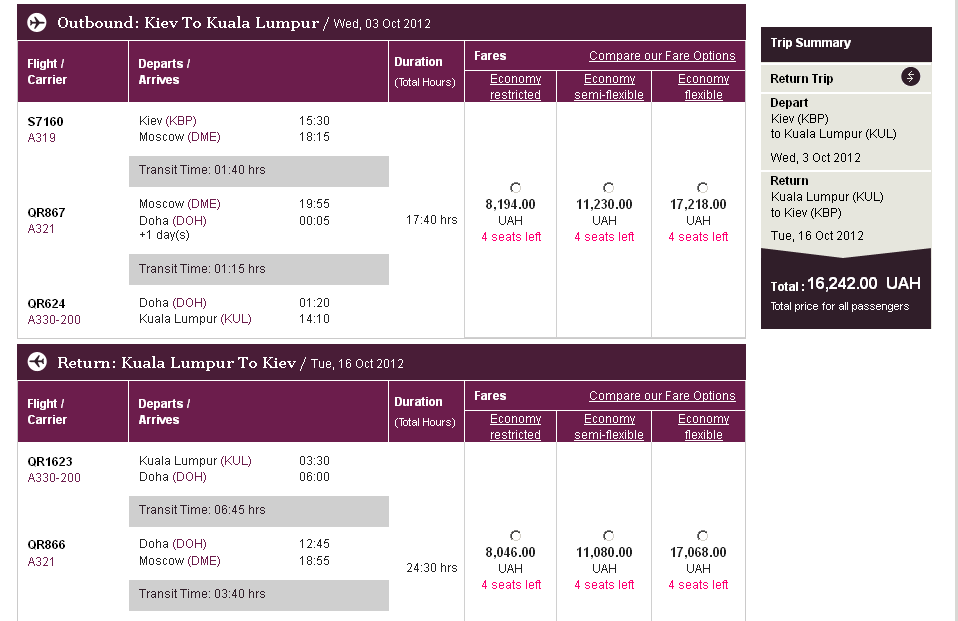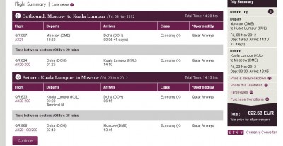 Катарцы опять стали продавать на своем сайте билеты из Киева (через Москву) Например Киев - Москва - Доха - Куал-Лумпур RT за 8121 грн