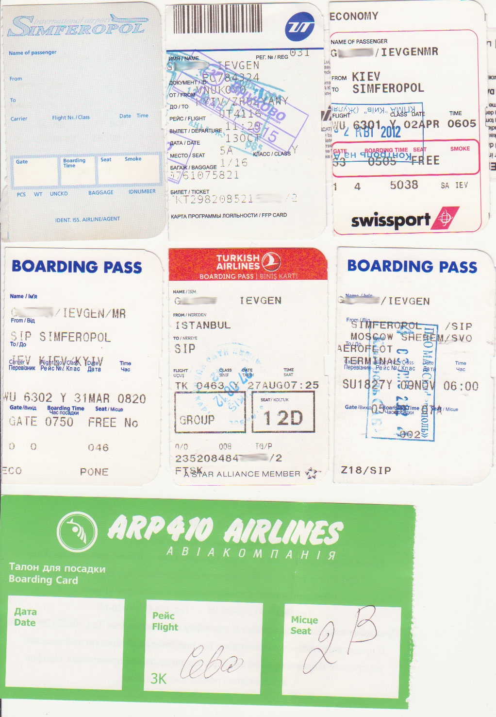 Из того, что попалось под руку. Первый - посадочный а/п Симферополь (аннексирован Россией) (а/к ARP410) образца 2006 года, надписи выцвели, если присмотреться к самому посадочному, видно, что там все написано русскими буквами. Остальное вроде и так понятно. Последний - 2003 год, Жуляны-Бельбек.