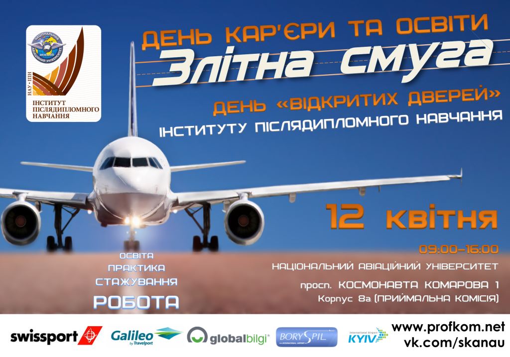 Запрошуємо прийняти участь у заходах «День кар’єри та освіти: Злітна смуга», та «День відкритих дверей» інституту післядипломного навчання НАУ, якій відбудеться 12 квітня 2013 року з нагоди дня авіації та космонавтики.