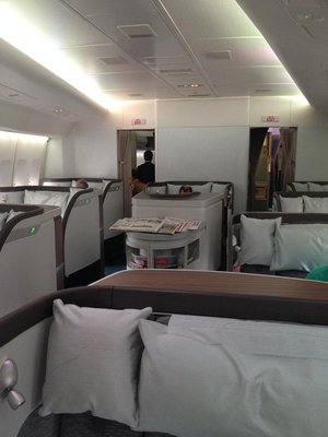 Борт Boeing 747-400, регистрационный номер B-HUE, оказался далеко не хуе, немотря на довольно почтенный возраст. В первом классе 9 так называемых сьютов: