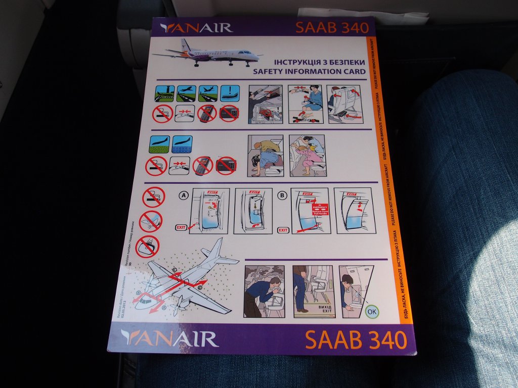Реєстрація почалася десь за годинку до вильоту. За моїм проханням отримав місце в кінці салону. Будьте уважні, спинки крісел в 11 ряду не відкидаются назад. Проте, думаю, там найнижчий рівень шуму та вібрацій. Літак Saab 340 UR-YAC. Через кілька днів виконується 25 років з дня його першого польоту (якщо вірити airfleets.net). Але солідний вік не відчувається зовсім. І ззовні, і зсередини все віглядає дуже здорово. В салоні дуже чисто, встановлено доволі зручні крісла Recarо. Місця для ніг, як на мене, достатньо.