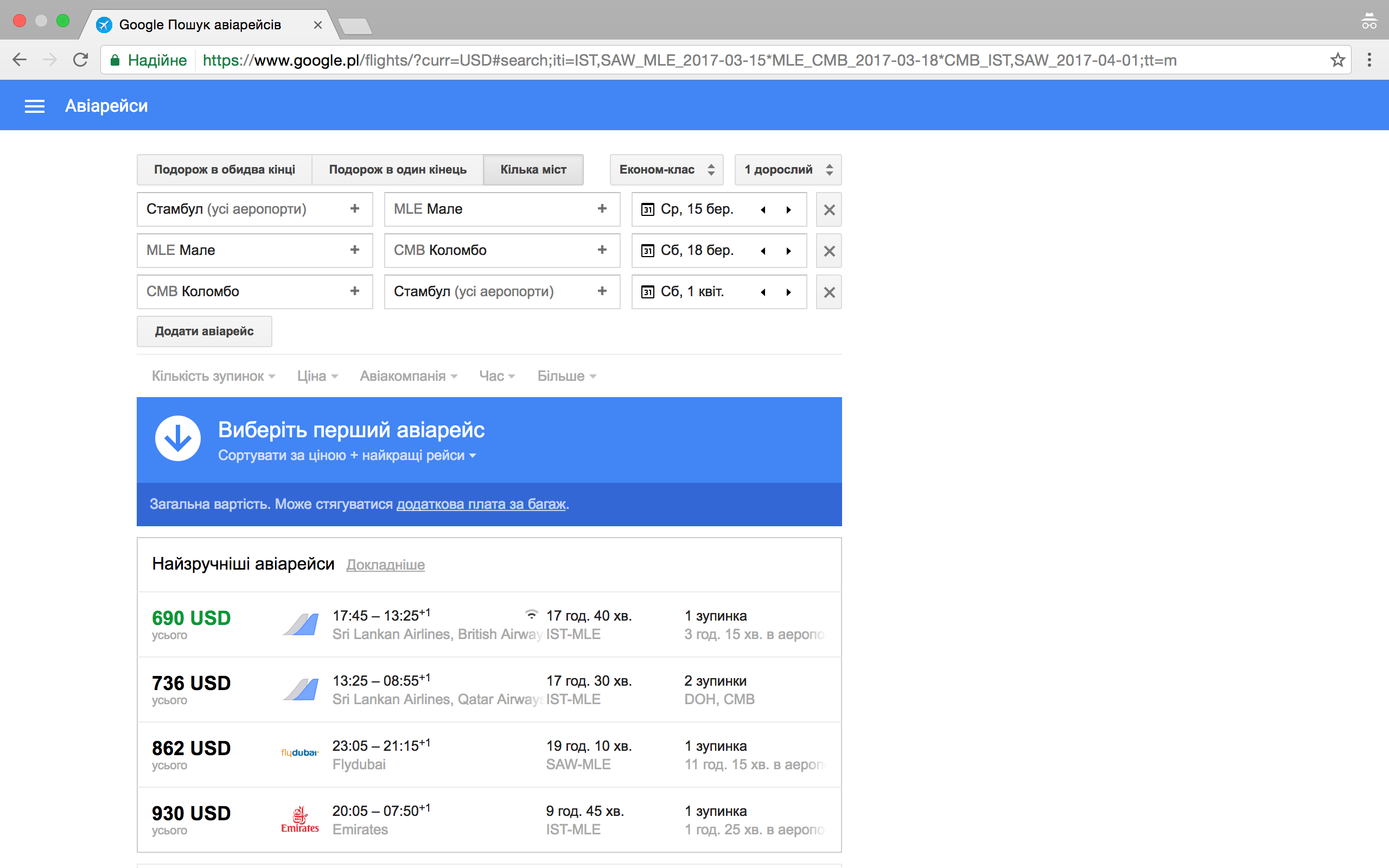 Думал ещё посмотреть Киев-Мале + Коломбо-Киев и отдельно Мале-Коломбо, но выходит дорого, Мале-Коломбо стоит минимум $171.
