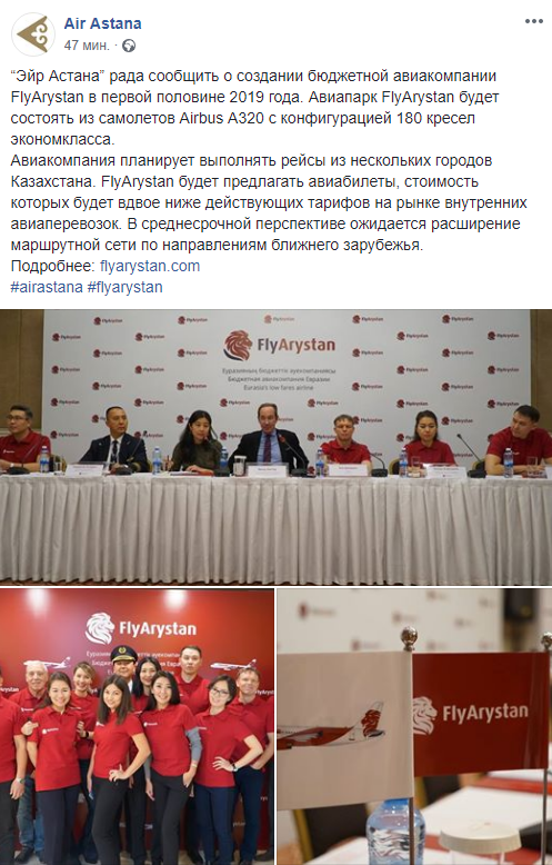 На базе Air Astana хотят создать лоукостер. Пошла мода на лоукостеры в Центральной Азии. Год назад узбеки обещали создать, хотя за это время ничего не поменялось, вот теперь казахи пытаются. Пока только у Azal вышло, но судя по темпам развития это явно не приоритет.