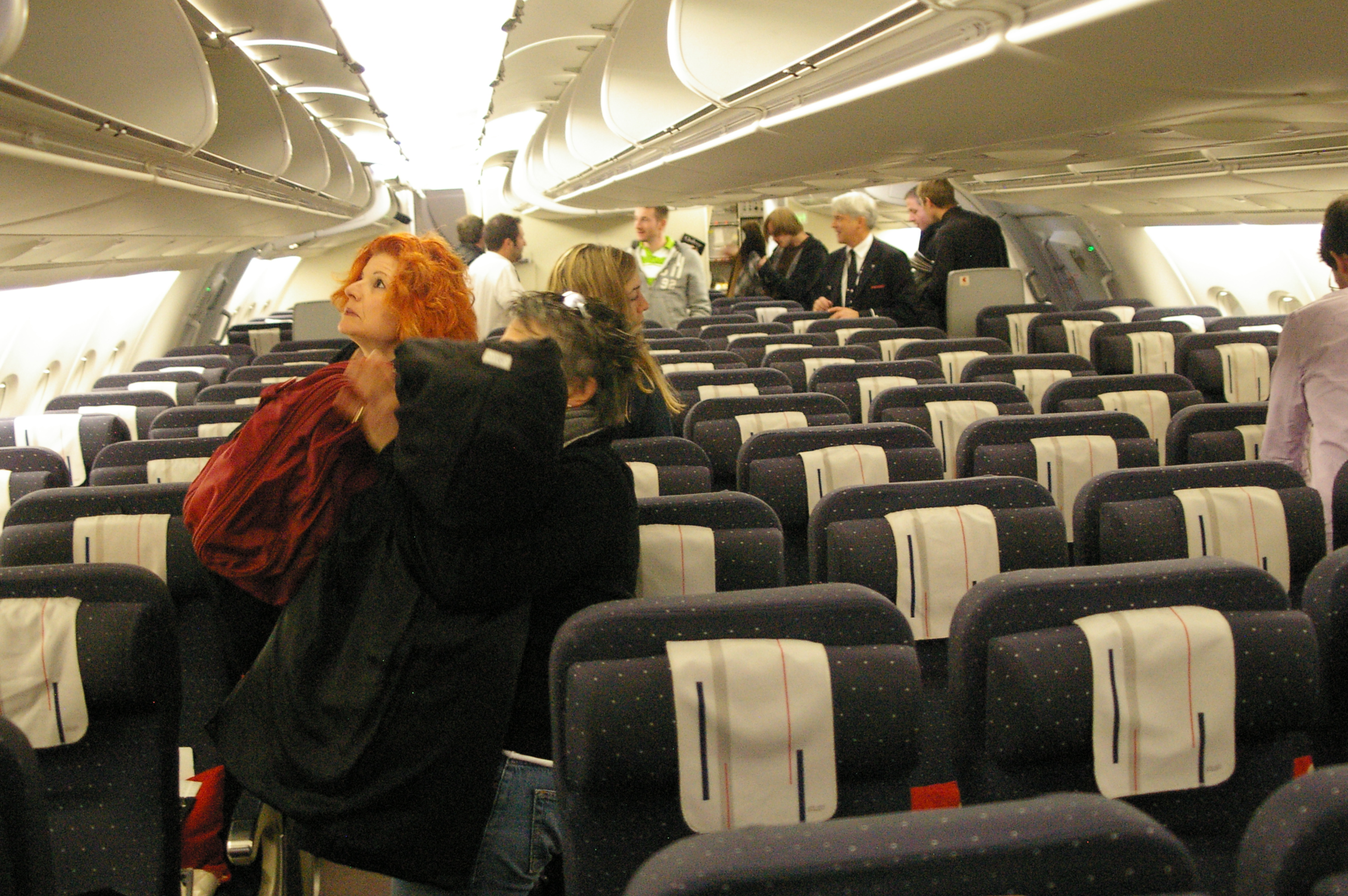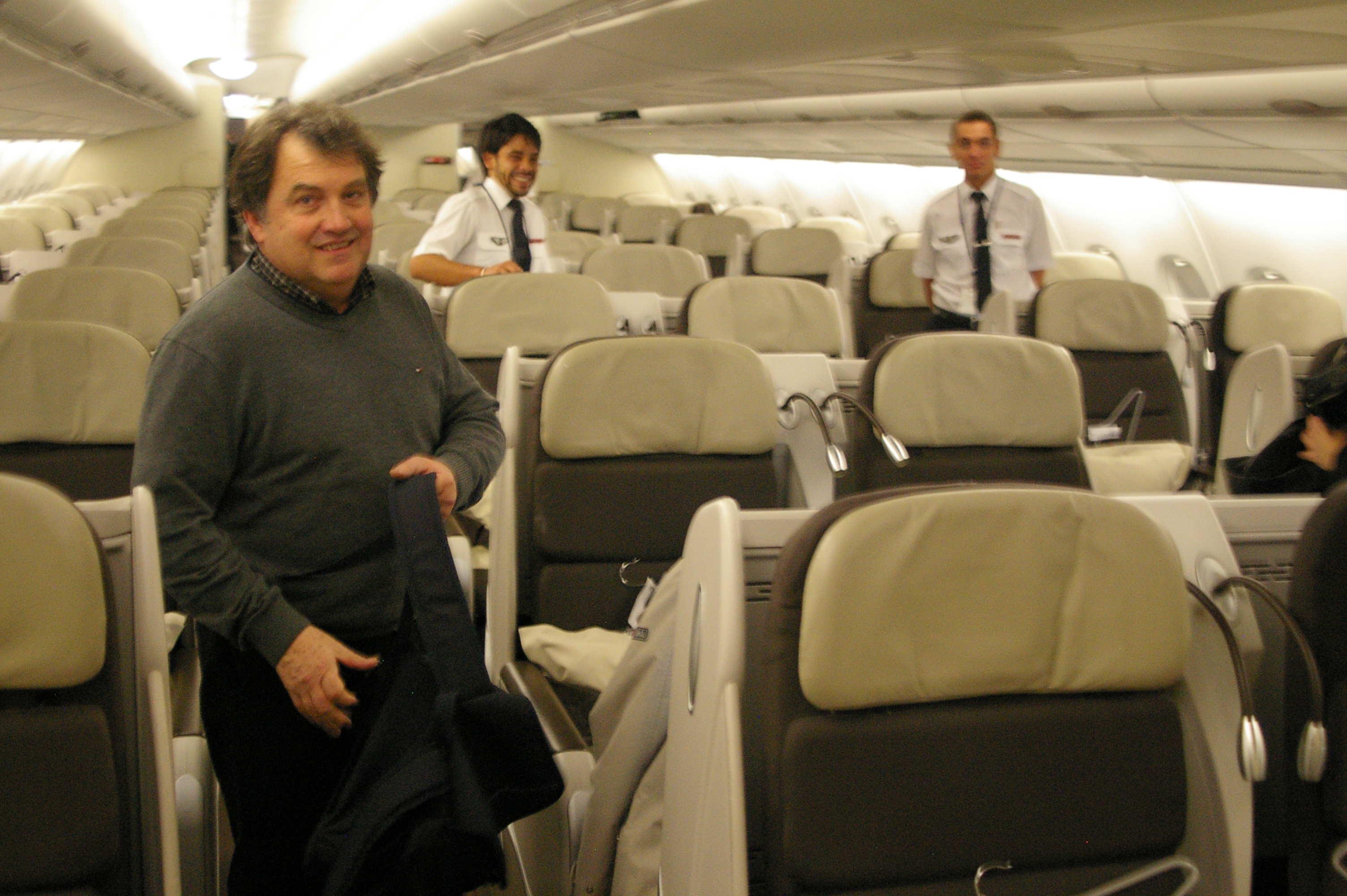 Літак як літак. Чимось нагадує 757. Розташування сидінь 2-3-2 чи 2-4-2 вже не памятаю зараз. Виходить досить зручно, якщо сидіти на одному з двох бокових. В порівнянні з американськими компаніями ЕрФранс відрізняється кращою їжою і можливо трохи привітнішими стюардессами.