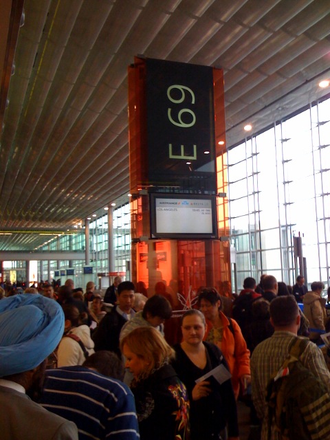 В 6.30 ничего не случилось--мы продолжали стоять на том же месте, хотя КВС вышел на связь и извинился за задержку по вине обслуживания в аэропорту. Где-то в 6.50 подъехал диайсинг и минут 10 водил своей штангой вдоль крыла туда-сюда, словно хирург, обдумывающий место разреза, или парикмахер, прокручивающий в уме ход будущей стрижки. В 7.05 пошла струя. Нас хорошо полили и мы тронулись. Пока доехали до "новой" полосы, набрали опоздния на целый час. В Париж прилетели с опозданием 45 минут. Стоянка--не у, а напротив Терминала Б2, поэтому тоже ехали к терминалу автобусом. Как всегда в Шарль де Голле, сразу за дверью в терминал стояла его работница, встречавшая транзитных пассажиров, которые уже опаздывали на свои пересадки. В их числе был и я (хотя до моего вылета оставался ещё час). Нас посадили в микроавтобус и экспрессом доставили до Терминала Е, откуда и вылетали все наши рейсы. Правда, от места высадки нужно было ещё подняться на 2й этаж, сесть на автоматический поезд, переехать к отдалённой части терминала, там простоять в очереди на секьюрити, и только потом идти к гейту. После Борисполя Шарль Де Голль всегда кажется другой планетой.