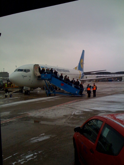 В "чистой" зоне открыли кафе Коста-Кофе (это их единственная точка в Украине) с маленьким американо + молоко за 43 гривны (без молока--35). Там я встретил знакомую шведку, летевшую в Стокгольм первым рейсом ВиззЭйра--на табло уже горело сообщение о задержке её рейса почти на час. Посадку на мой рейс объявили где-то в 6.05, и все стали спускаться в автобус, который никуда не трогался добрых полчаса, а продолжал стоять с открытыми дверьми (на улице было -11). Наконец мы моехали. Сделав круг почёта, автобус практически вернулся к тому же месту, с которого уехал, т.к. наш самолёт стоял прямо напротив "нашей" двери--метрах в 50-ти. Все сразу ринулись на трап, но, т.к. внутри каждый стряхивал снег и снимал кучу одежды, на трапе пришлось постоять и помёрзнуть хороших минут 5. С трапа можно было созерцать кабину пилотов нашего "Маугли", а также снег, прилепившийся ко всем выступающим частям самолёта. Когда все зашли расселись, отдельным автобусом подвели пассажиров с маленькими детьми--хорошо хоть их не додумались держать на морозе (то в автобусе, то на улице) полчаса.