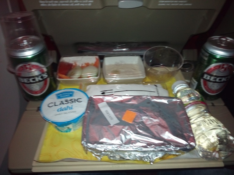 Бирьяни, овощи, какой-то соус, молоко, вода, металлические приборы и любой алкоголь на выбор, в моем случае пиво. Стюардесса настояла, чтобы я взял два)))