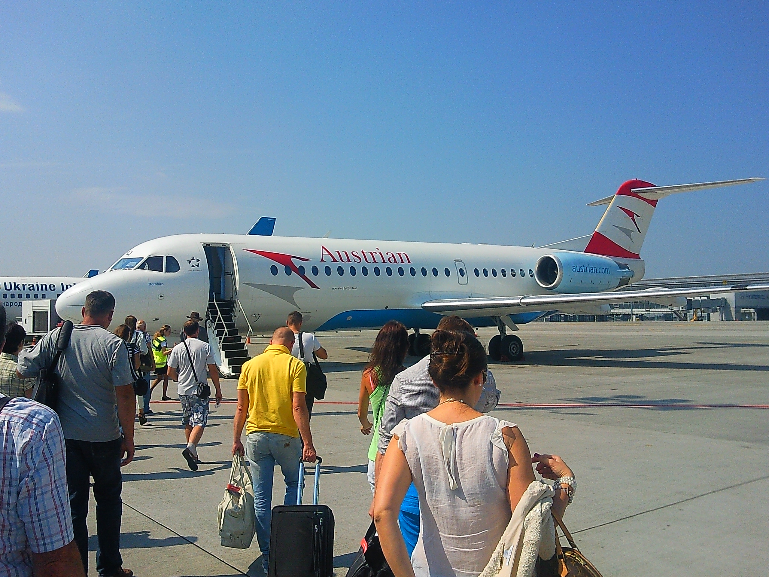 За 24 часа зарегистрировался онлайн на OS664. В системе стоял Fokker70, взял место 6F,сразу за «так называемым бизнес классом». До этого Austrian не летал, так же как и на Фоккере. Рейс утренний в 10:50. Какого-то черта дернуло приехать в Борисполь за 2 часа до отправления, хотя имел посадочный на руках. Как оказалось после – правильно сделал. Количество людей на вылет утром поражало. Паспортный контроль не справлялся и очередь доходила прямо на секьюрити чек и таких потоков было три. В общем, все проверки заняли около часа, осталось подождать немного и объявили посадку на 5 минут ранее заявленного. Я даже удивился зачем, самолет ведь небольшой за 15 минут точно все разместимся. Ну ок пошел в автобус, стали ждать пассажиров, 5 минут, 10, 15, да сколько можно…после 20 минут ожидания тронулись. Вопрос, зачем начинать посадку ранее нужного? Это маринование людей при +26 улыбок не добавляет.