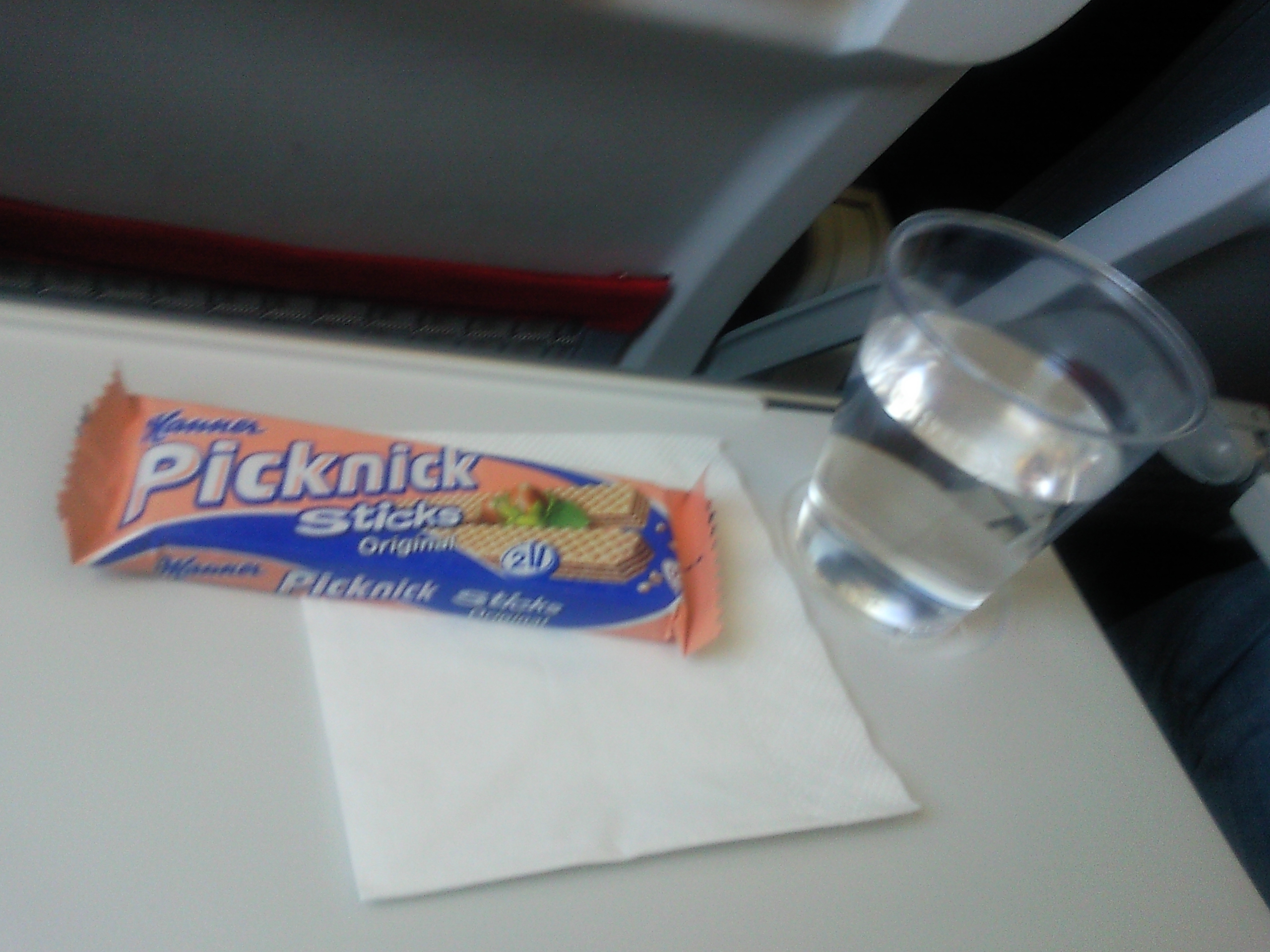 Я знал, что на этом маршруте практически не кормят, а так печеньки-бутерброды, но мне наверное не повезло – Austrian раздавал только напитки… Была возможность за 19usd. приобрести заранее завтрак, но как-то на сайте он выглядел неубедительно. Поэтому довольствовался соками-водами и сном (хотя за 530usd.RT могли какую-то орешку и принести).