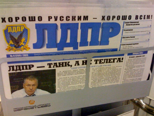 До вылета было много времени и я погулял по терминалам "Е" и "Д" (т.к. обычно летаю только между Киевом и Москвой, вижу только "Ф" и "Ц"). В полпятого утра всё очень сонное и пустое. Из "Е" в "Д" ведёт длинный, местами извилистый переход с травалатарами кое-где (а кое-где без них). По дороге в "Д" наткнулся на большое пустое пространство, где под стеночкой спали люди. В Москве в конце апреля было довольно холодно, поэтому люди спали в пальто. Насколько я понял, в такое время ни одна стойка регистрации в "Д" ещё не работала. Хотя, до конца терминала я не дошёл, т.к. очень далеко. Несколько позабавил выбор бесплатной прессы на аэропортовских стендах. На таможне вообще никого не видел, на секьюрити, как всегда в Москве, всё снять и вынуть, руки поднять, паспортный контроль быстро, но с вопросом о цели поездки (интересно, какое дело российским погранцам?).