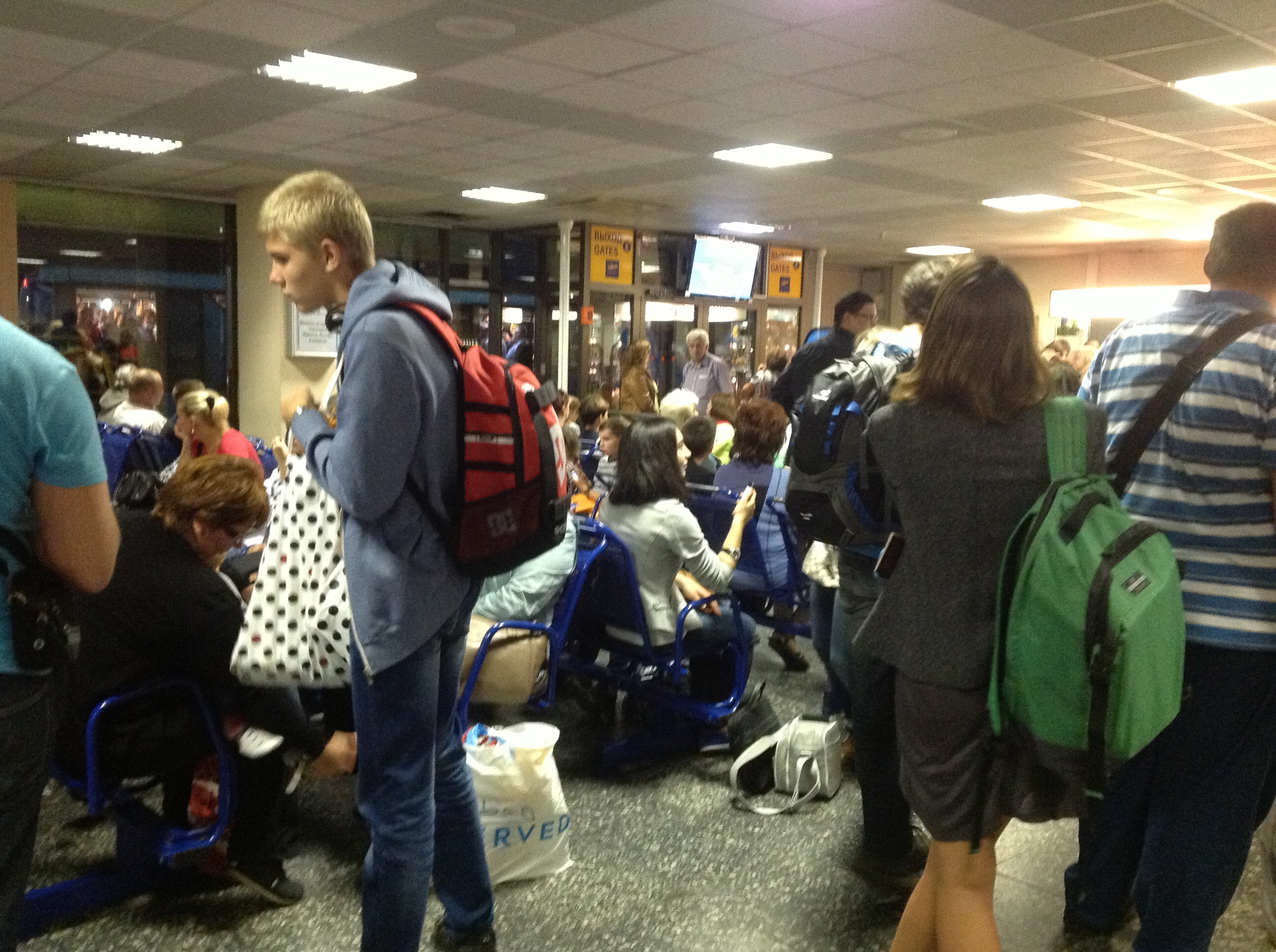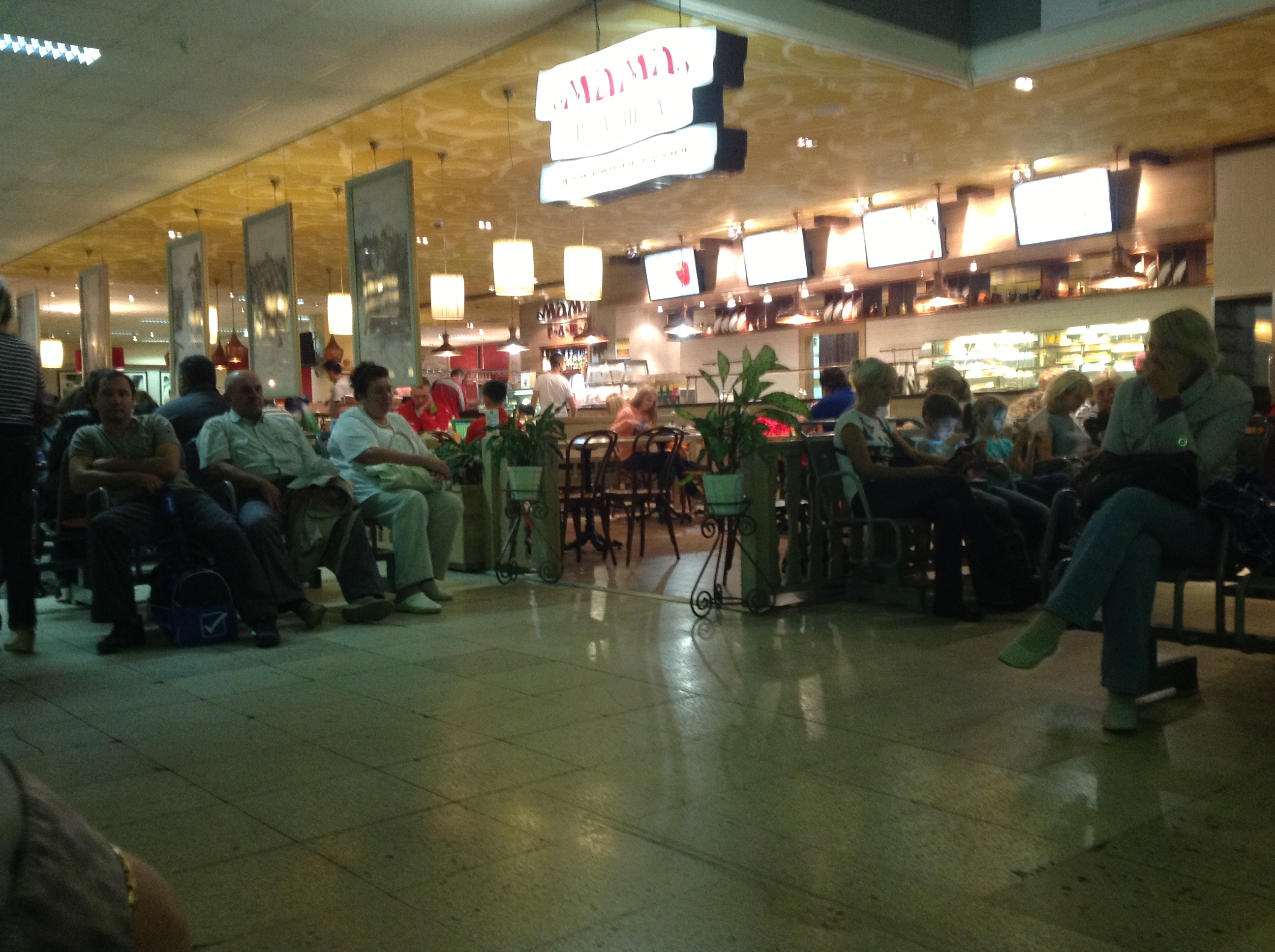 В какой-то момент стали объявлять, что посадка на рейс в Калининград будет не из сателлита, а через гейт в основном здании, и всем, кто уже "приехал" в сателлит, нужно "ехать" назад. Очень долго объявляли одного пассажира, который вдруг услышал свою фамилию и, как ошпаренный, ринулся вниз по лестнице в подземелье.