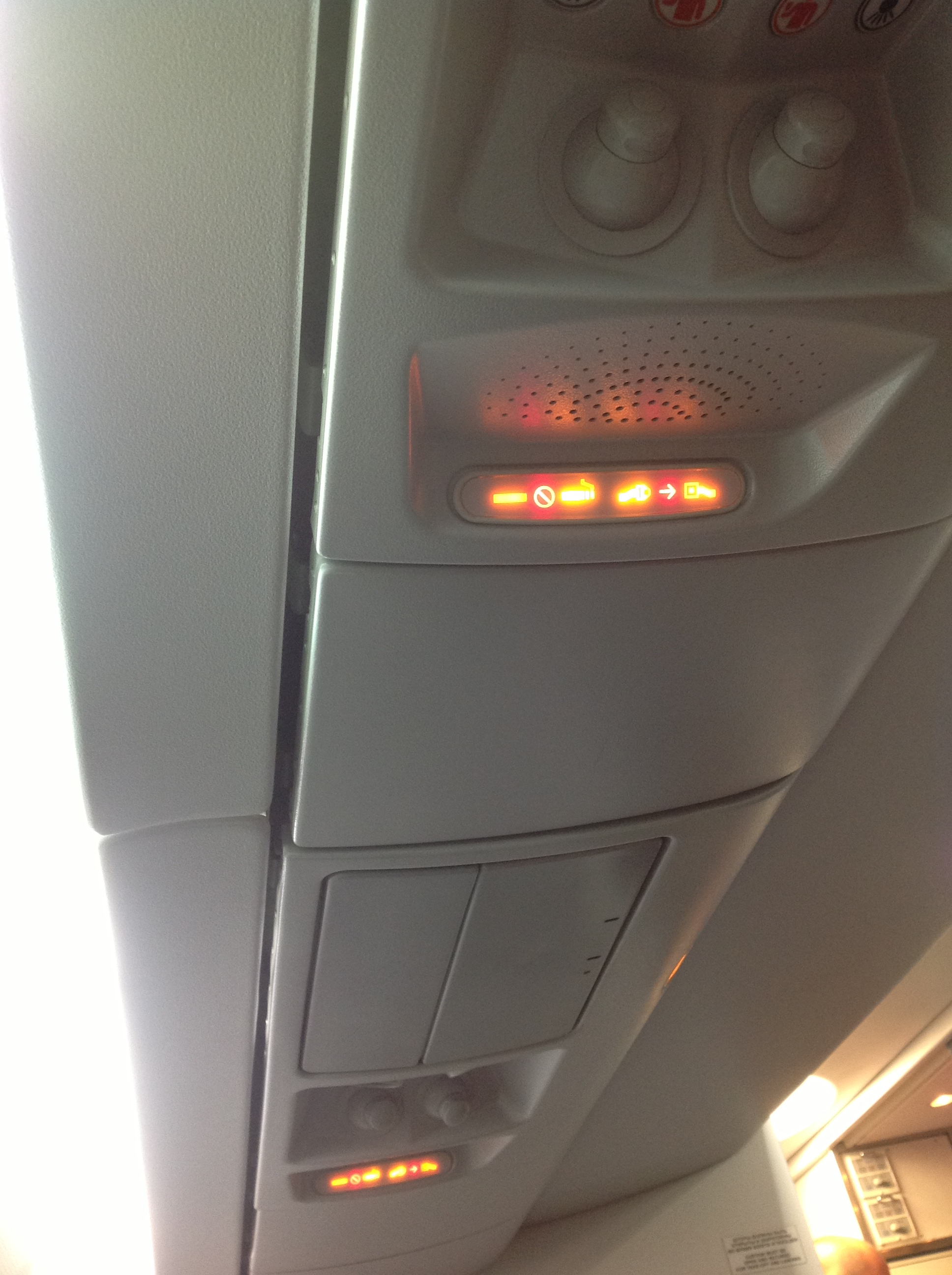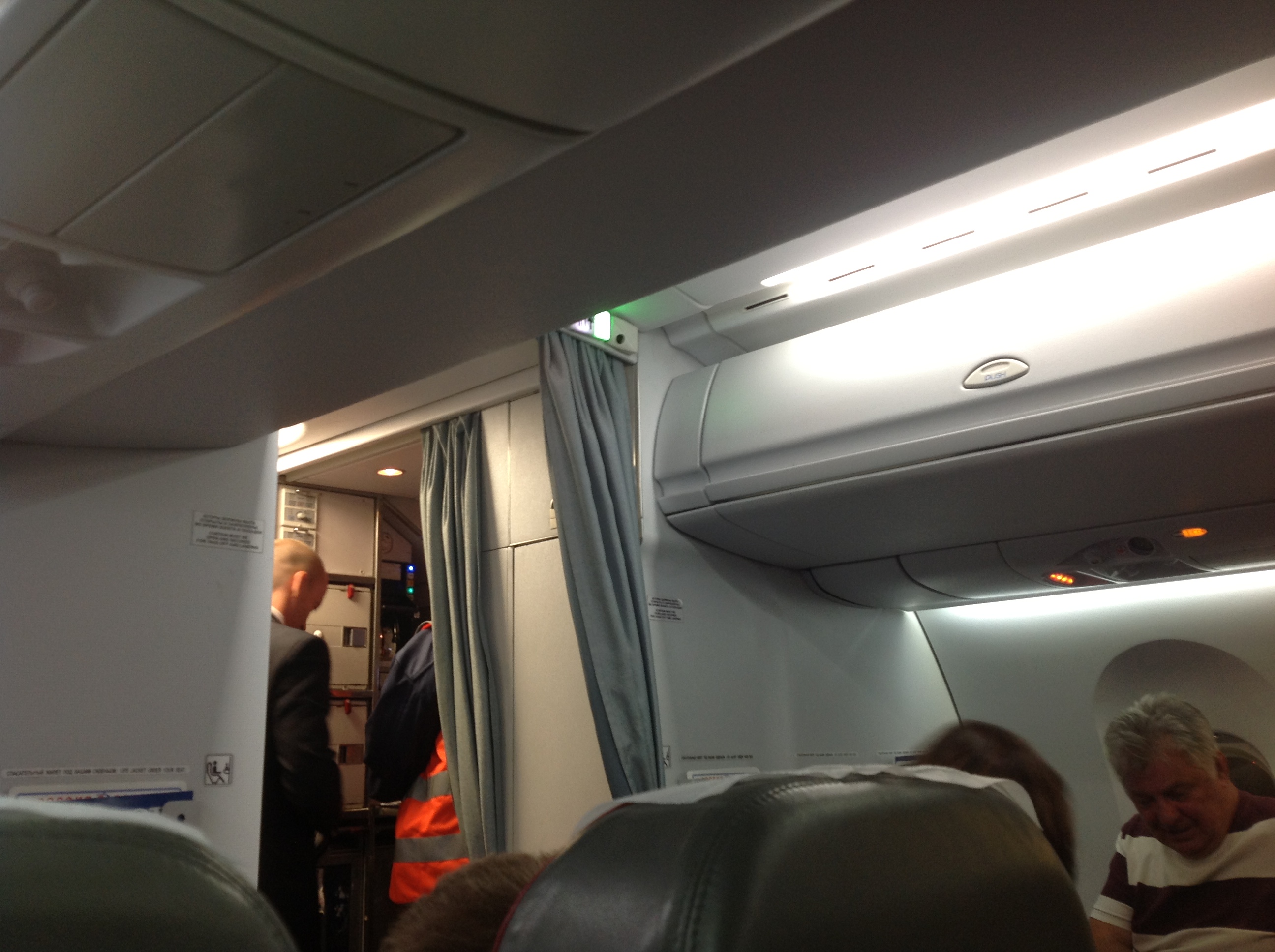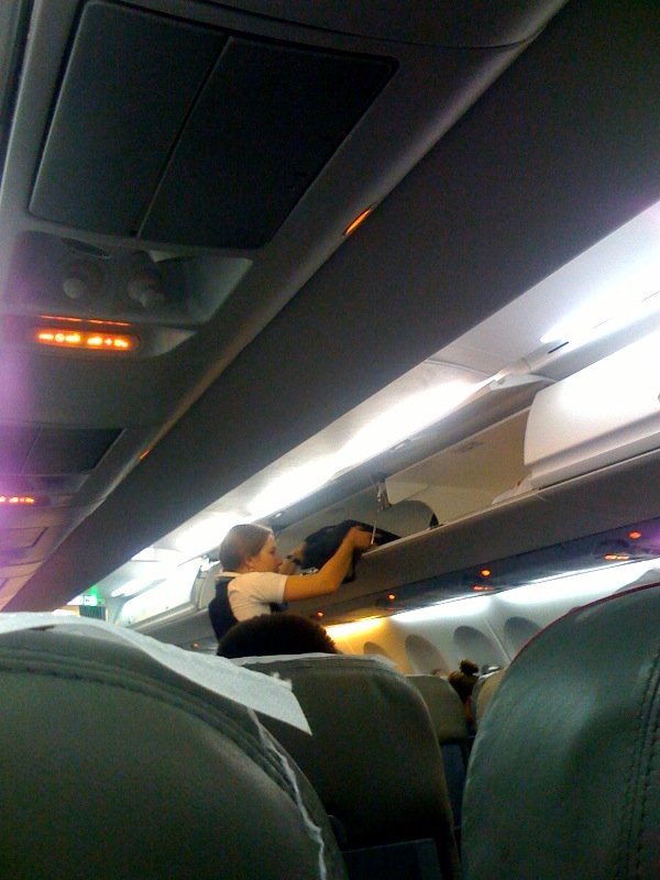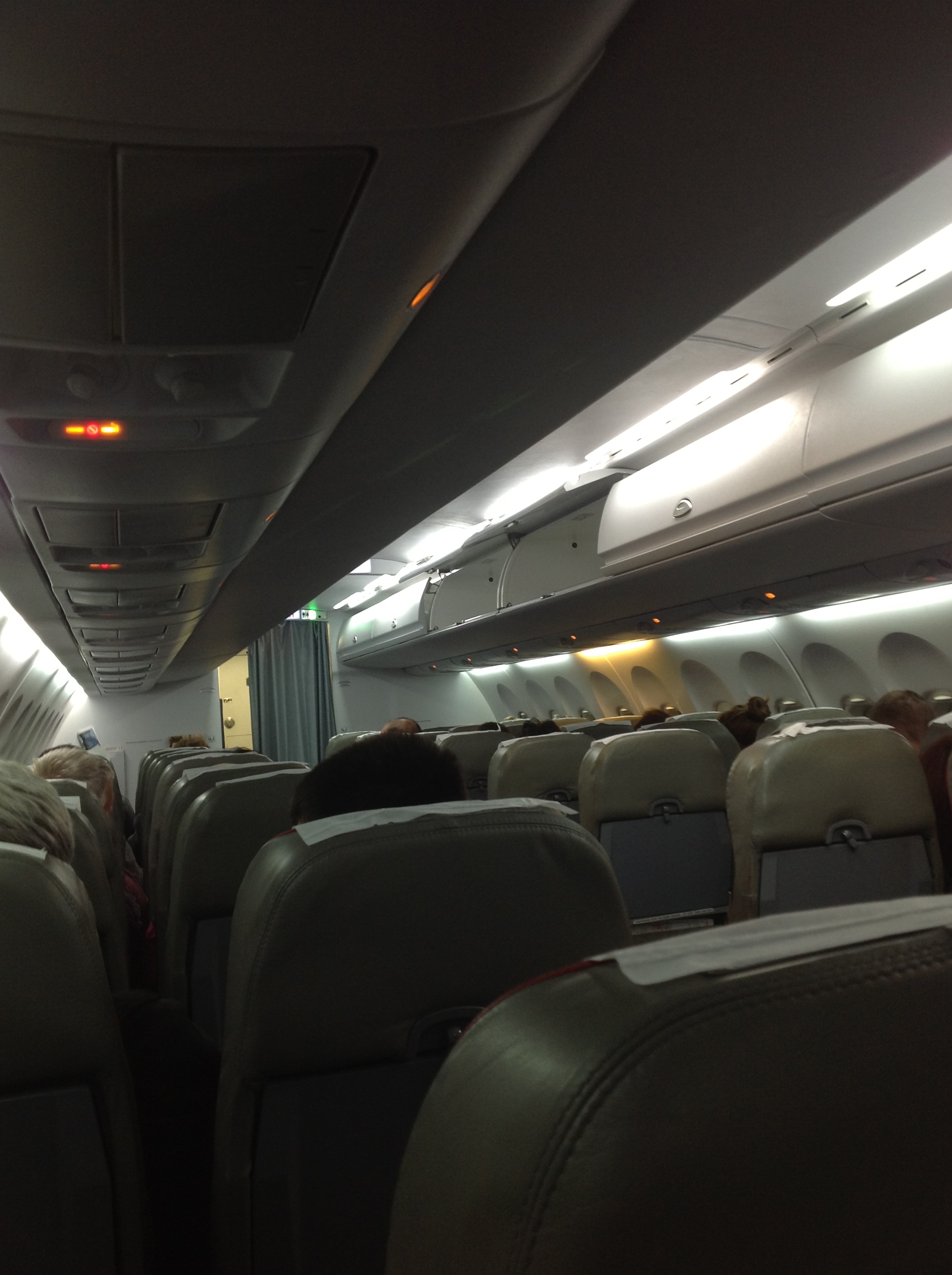 Опять посадка через автобус (хотя самолёт стоял метрах в 60 от терминала). Когда все расселись, стало понятно, что борт заполнен чуть больше, чем на треть. В принципе, можно было бы и лечь на 3 сиденья.