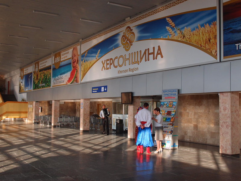 Вылет по расписанию в 9 утра, поэтому по привычке приехал в аэропорт за 2 часа - в 7 утра. В аэропорту Херсона я до этого не бывал. Терминал удивил размером и выглядит очень достойно. Тем более, что погода стояла отличная. Рядом видна диспетчерская вышка. Зайдя внутрь попадаем во внушительного размера холл, очень светлый, с достаточным количеством мест для сидения. В честь первого рейса играл аккордеонист. В зале также находились работники аэропорта, ребята в национальных костюмах. Там же прохаживались первые прибывшие пассажиры. На единственном табло (других не видал) отображалась информация о единственном же (пока) рейсе. Стойка регистрации в зале одна. Народ периодически подходил и интересовался, не началась ли еще регистрация. Но регистрация началась только около 8:00. К этому моменту подтянулось большинство пассажиров, а также телевидение и пресса. У пассажиров брали интервью. Стойку регистрации окружила плотная дружина людей с фотоаппаратами. Я тоже зарегистрировался. Девушка за стойкой спросила есть ли у меня распечатка билета. Распечатки не было и она слегка растерялась. Но быстро сориентировалась и нашла меня в списке пассажиров. И выдала пустой посадочный талон