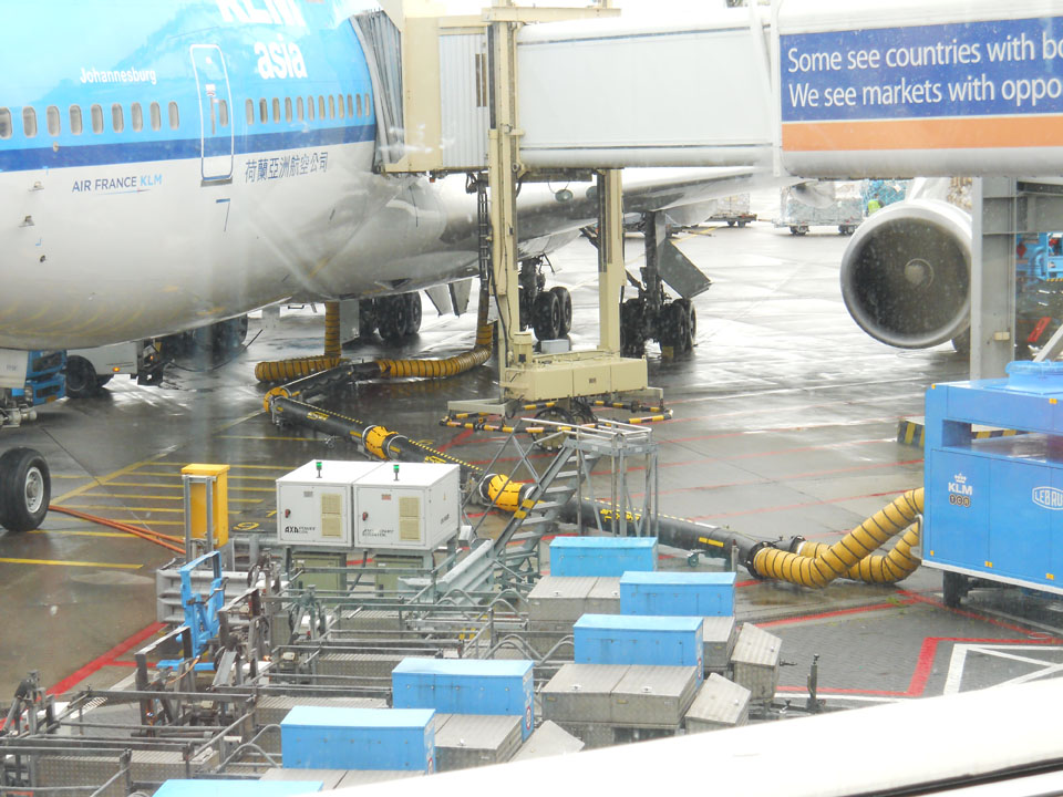 Тут трохи сталася затримка. Замість нашого літака, який поламався, прислали інший, більший Б-747 KLM Asia, компоновка 3х4х3. Він був неприбраним з попереднього рейсу, тому затримка затягнулася.