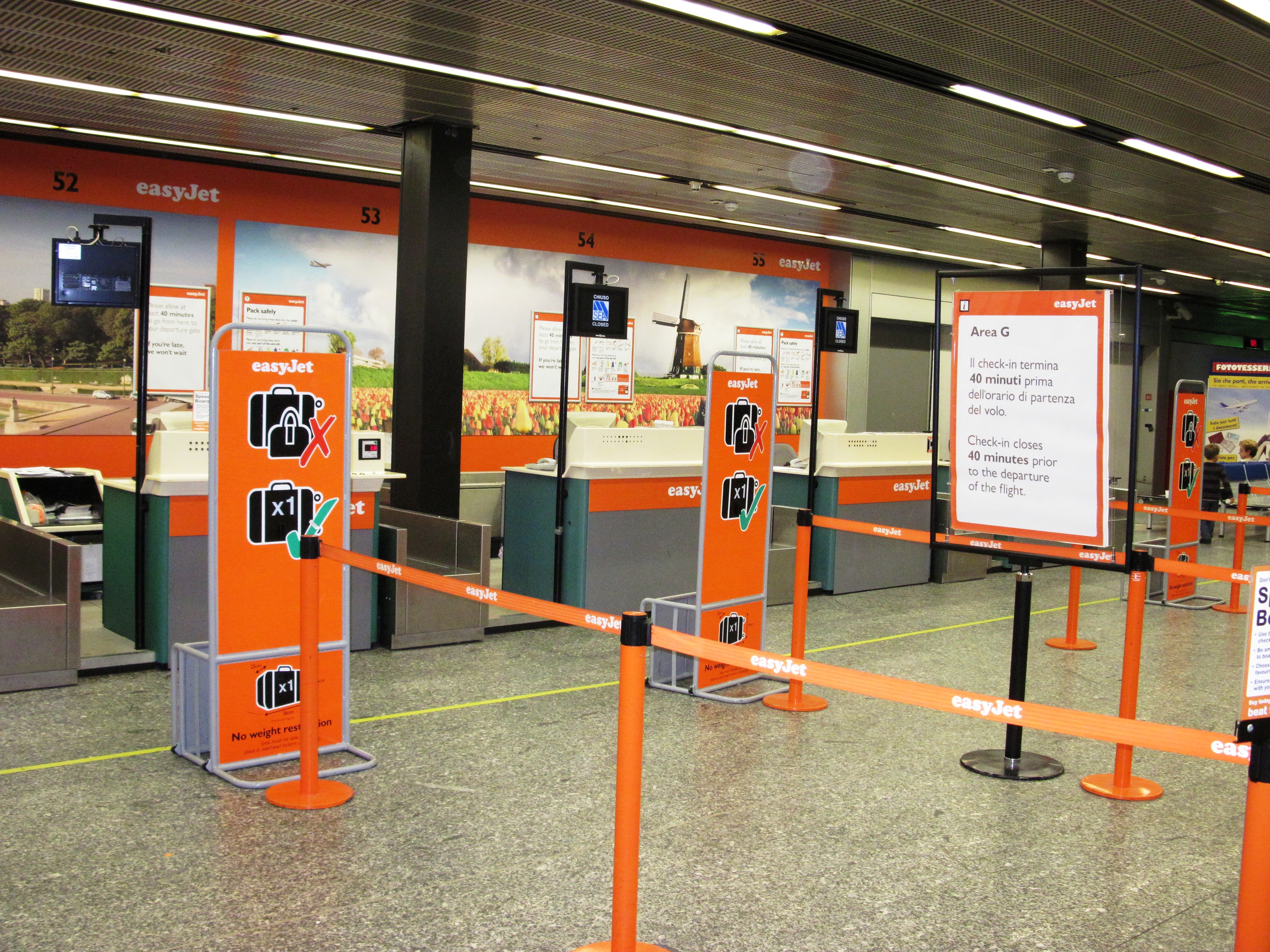 Easy Jet имеет собственную зону регистрации в терминале (см. на фото). На регистрации чётко проверяют багаж (на соответствие норм).