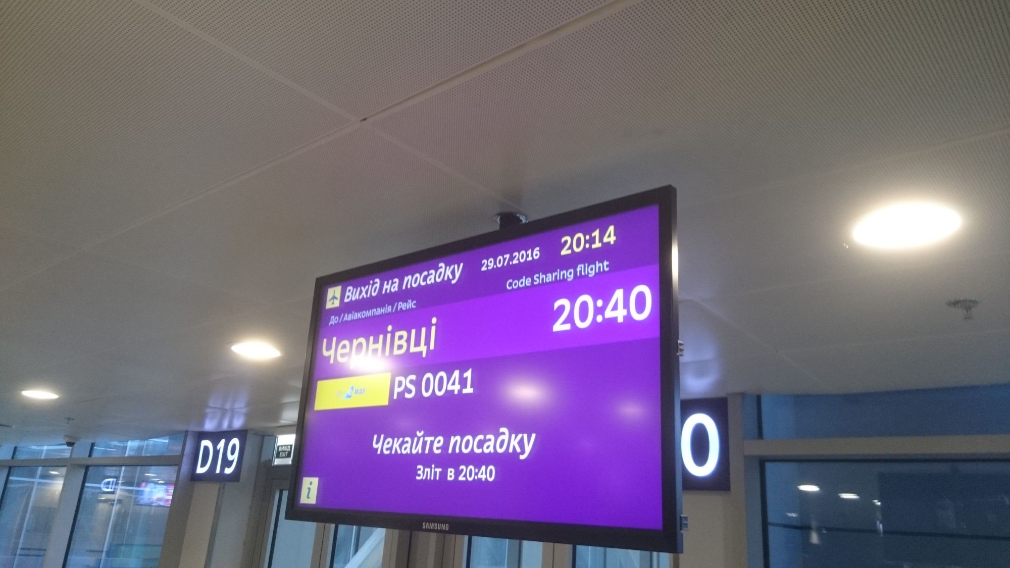 Быстрый разбег, еще несколько кидков по плитам, взлет, разворот над Черновцами (какой же холмистый город!) и летим в Киев. Посадка, внезапно, на противоположную терминалу Д полосу, не помню вообще, чтобы я до этого там садился, и заруливание на стоянку возле терминала В.