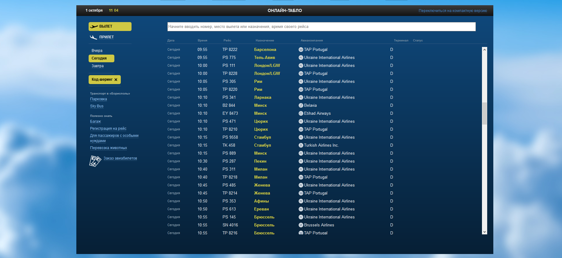 Кто-то в курсе, что случилось с табло на сайтах аэропорта Борисполь? Со вчерашнего дня не работает "статус рейсов", а на завтра (02/10/16) и вообще рейсы не показывает..