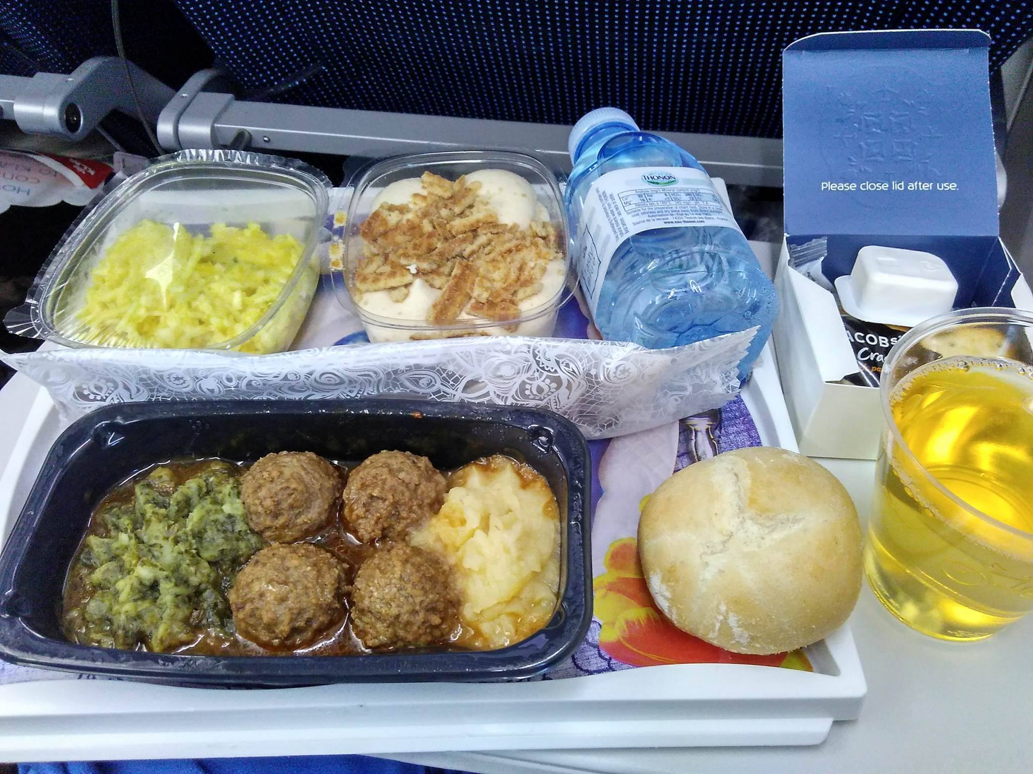 На зворотньому шляху замість печива-літачків була вівсяна печенька з журавлиною (а дружині попалась з білим шоколадом). Замість лазаньї були макарони, а курочка була з картоплею пюре і картоплею шматочками. Один раз давали "шайбу" з джерельною водою і один раз просто наливали воду з пляшки а-ля МАУ.