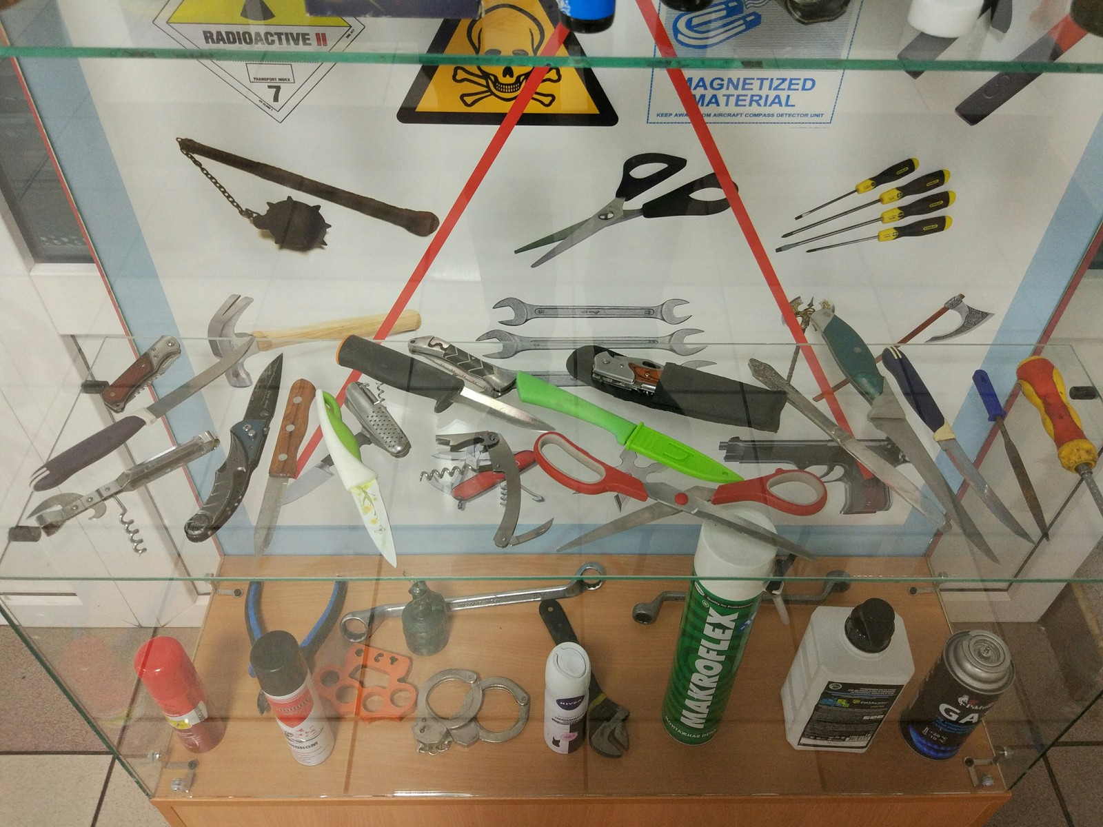 стенды в аэропорту с конфискованными вещами которые пытались пронести на борт самолёта...
