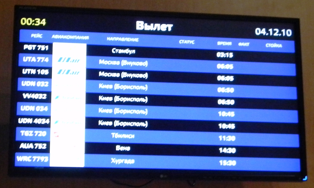 В аэропорту вообще 2 табло - прилёта и вылета возле стойки информации на которой сидит девушка, которая внятно ничего не знает и обьяснить не может))). оч неудобно. До него - впадло ити))).
