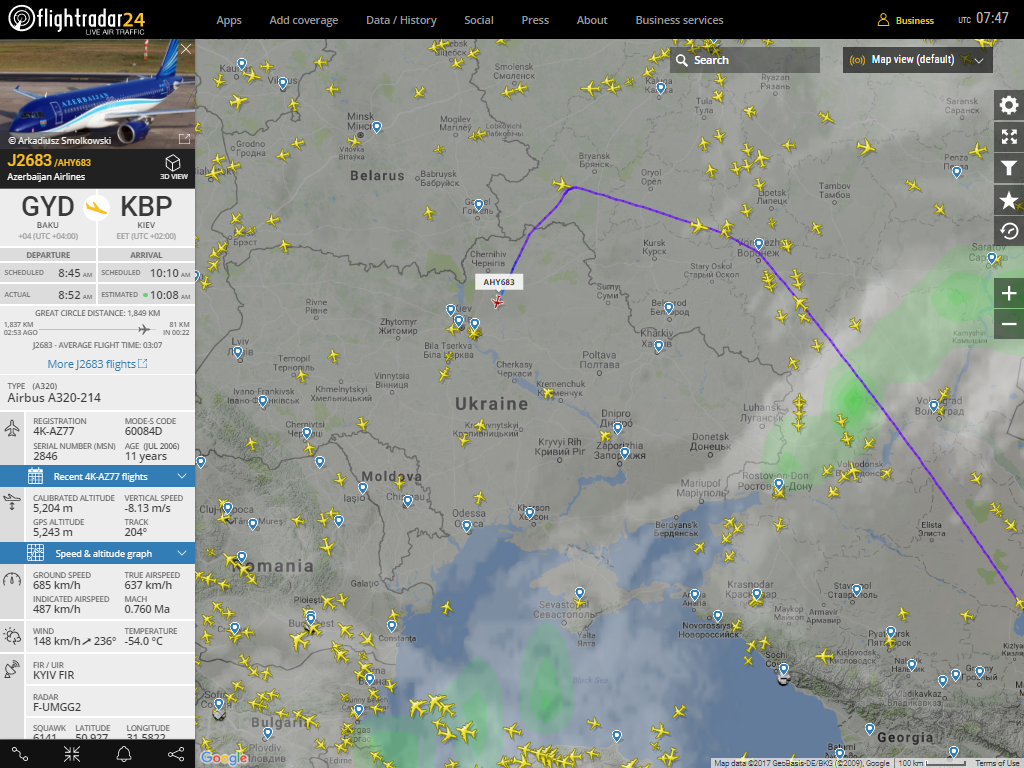 Вот ещё пример. Это рейс ежедневно очень далеко облетает Украину. Если россияне пролетают в 30 км от зоны АТО сотнями самолётов в день, то эти летят из Баку в Киев через Волгоград, Воронеж, Орёл и Брянск, а потом разворачиваются и залетают с севера. Вместо того, чтобы после облёта закрытой зоны сразу влететь в Украину и пролететь над Харьковом. И это не облёт грозы, это ежедневный маршрут. Разница в маршрутах 350 км в каждую сторону, как от Харькова до Киева по прямой.