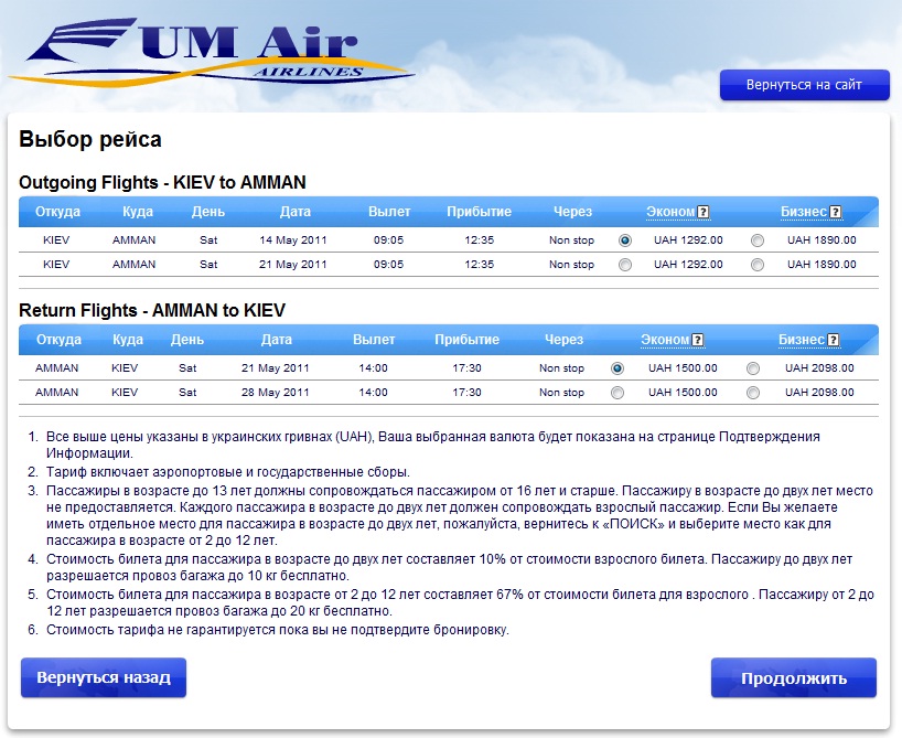 Кстати, если заказывать авиабилеты прямо у них на сайте, то можно получить скидку 3% от стоимости авиаперелёта. Приятно:)AlexK писав:На сайте UM Air этот рейс указан раз в две недели, билет "туда и назад" около 500 евро.AlexK писав:В расписании на июль (издаваемом КийАвиа) появился рейс UF Киев-Багдад по средам.
