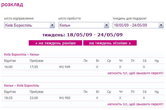 Germanwigs починає літати до Києва. Рейси будуть здійснюватись з аеропорту Кьольн-Бонн тричі на тиждень, згідно повідомлення компанії, в вівторок, четвер та суботу, починаючи з 16 травня. Цікавим є те, що нетипово для бютжетних перевізників, компанія пропонуватиме варіанти з пересадками. Літак стартуватиме з Кьольна близько 11.00 та прибуватиме до Києва близько 15.00, за годину стартуватиме до Кьольна прибуваючи близько 17.45. Квитки надійдуть в продаж з 4.03.09, в якості маршрутів з пресадкою пропонуватимуть Берлін-Шьонефельд, Мюнхен, Лондон-Странтед, Будапешт та Відень.