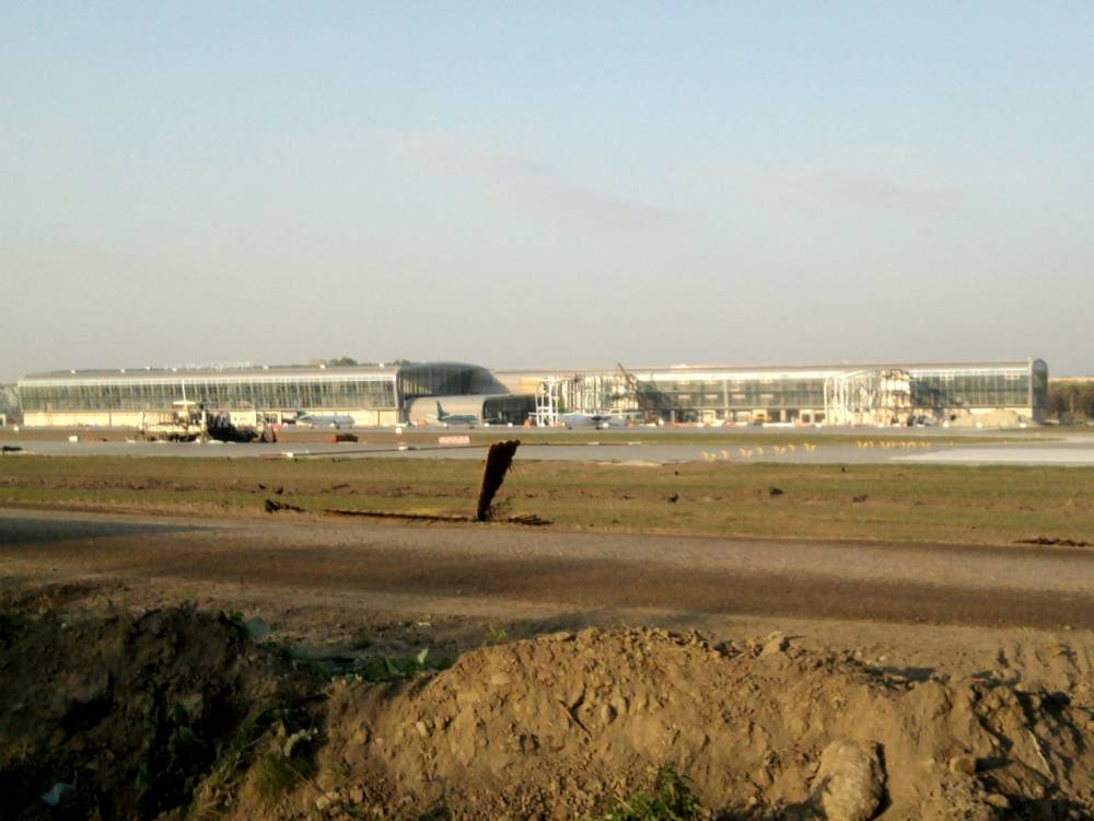 Другу частину ЗПС роблять дуже хорошими темпами. Купа народу і техніки. Двіж серйозний. Ще б усе так у нас будували. Вантажні машини літають з інтервалом 1-2хв. Будівельникам не позаздриш. Над головами взлітають літаки, а при взльоті їх здуває і накриває пилюкою і тд.