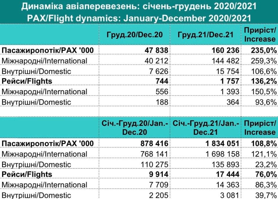 За оперативними даними ДП «МА «Львів» ім. Данила Галицького» у грудні 2021 р. авіаперевезеннями скористалися 160,2 тис. пасажирів, що на 235,0% більше, ніж у грудні 2020 р. (47,8 тис. пасажирів). Кількість здійснених рейсів – 1 757, що на 136,2% більше, ніж аналогічного періоду минулого року (744).